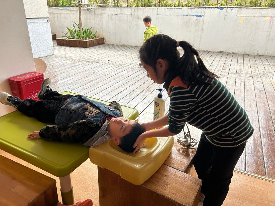 “瑶瑶理发店”开张了!瑶瑶姐姐耐心地为弟弟洗头,引来了不少小顾客。糟糕!顾客扎堆了,怎么办呢?祺祺搬来了小椅子,让小顾客坐着等待。瞧!这个短视频真有趣,我们一起来看看吧!