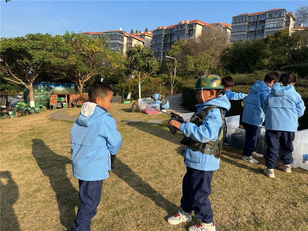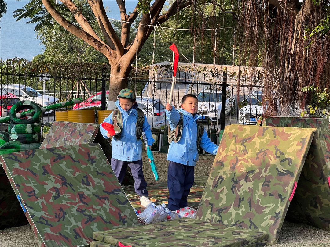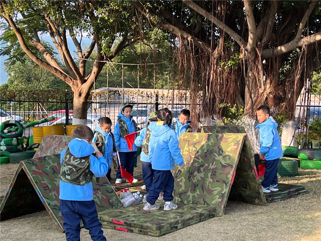 “野战基地”也传来了宝贝们的欢笑,“小战士”们组成小队,认真地商量着作战计划,做好了热身和“训练”,一起在迷宫里躲藏、对战、探险,插上小红旗占领自己的小领地。