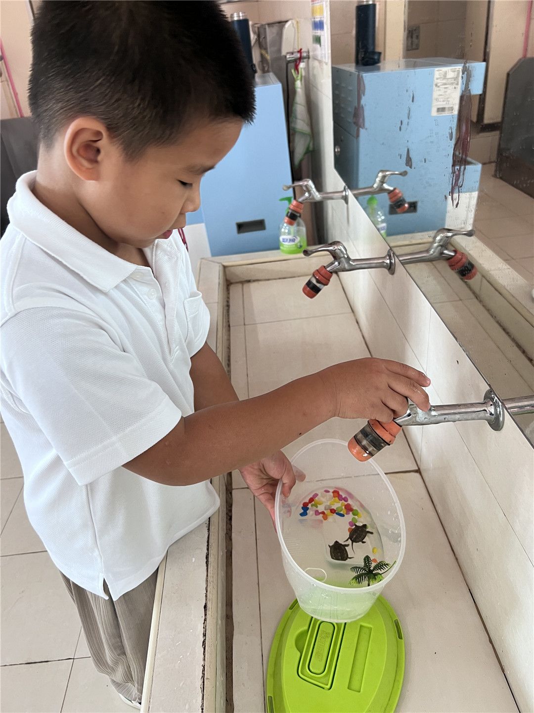 近距离观察乌龟的肚脐,孩子们发现乌龟宝宝刚出生时肚子下面还有个红红的肉球,那是小乌龟的肚脐,等到龟宝宝的肚脐长好后才可以下水哦!