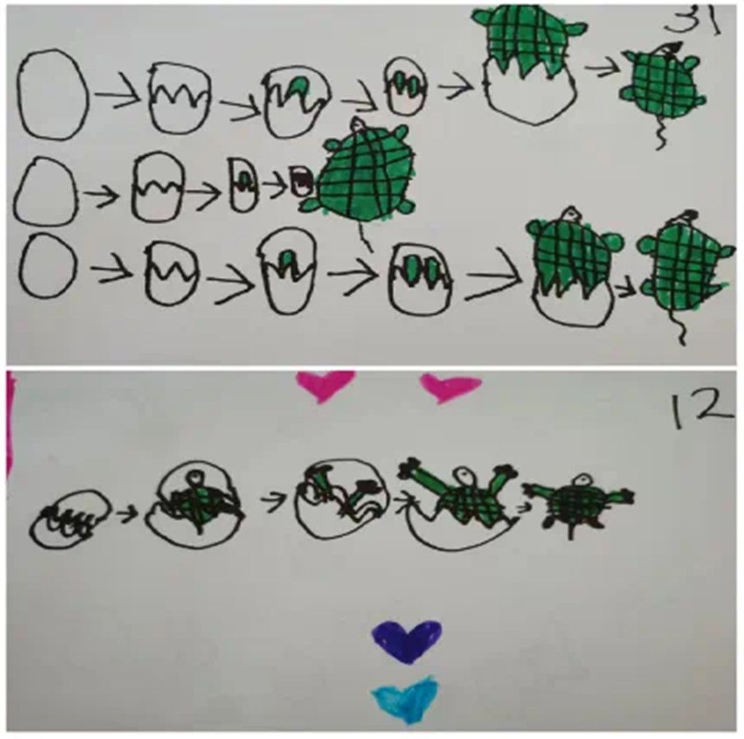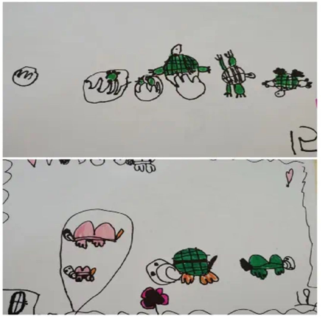 孩子们每天给认真地换水、喂食和晒太阳,同时认真记录,让我们一起来画一下乌龟蛋的孵化过程吧!