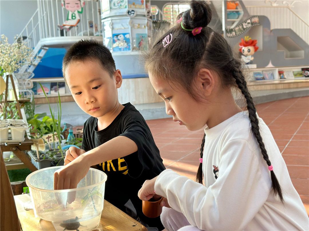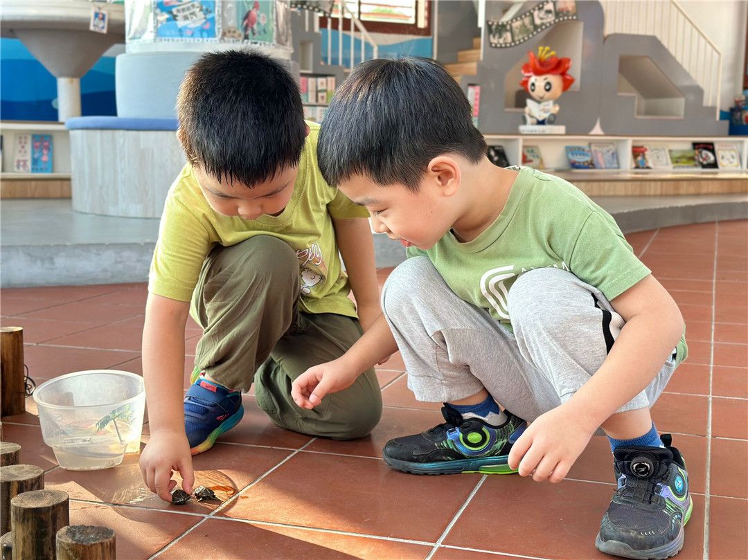 孩子们一边观察小乌龟一边兴奋地交流着。
