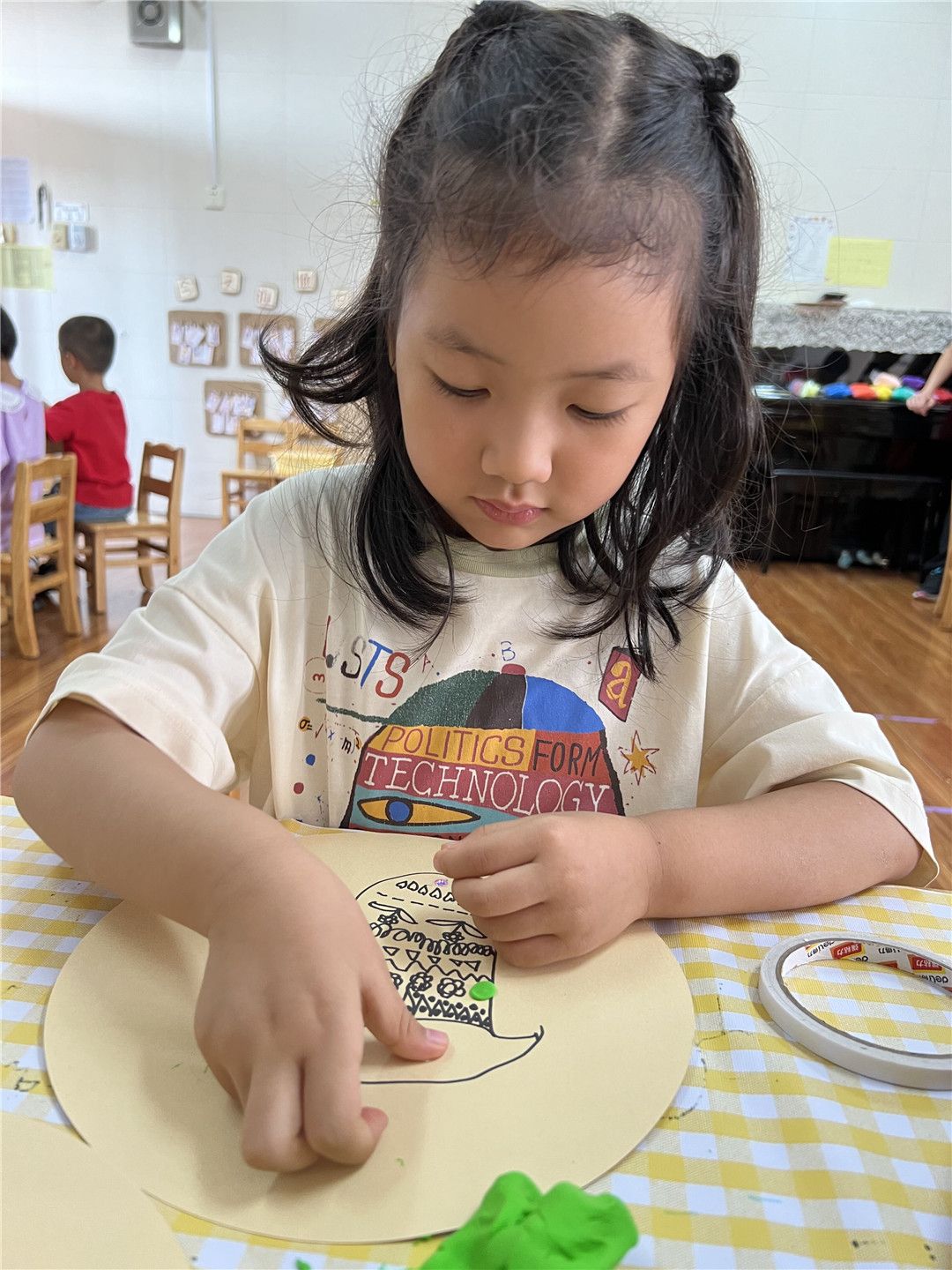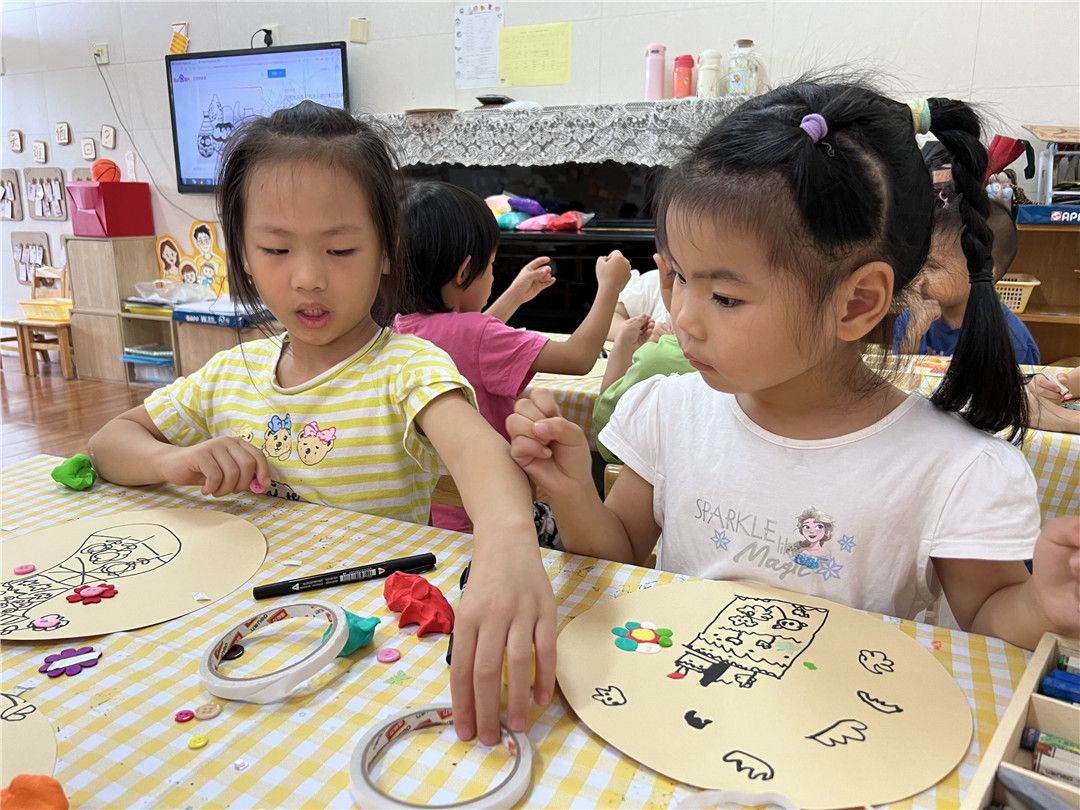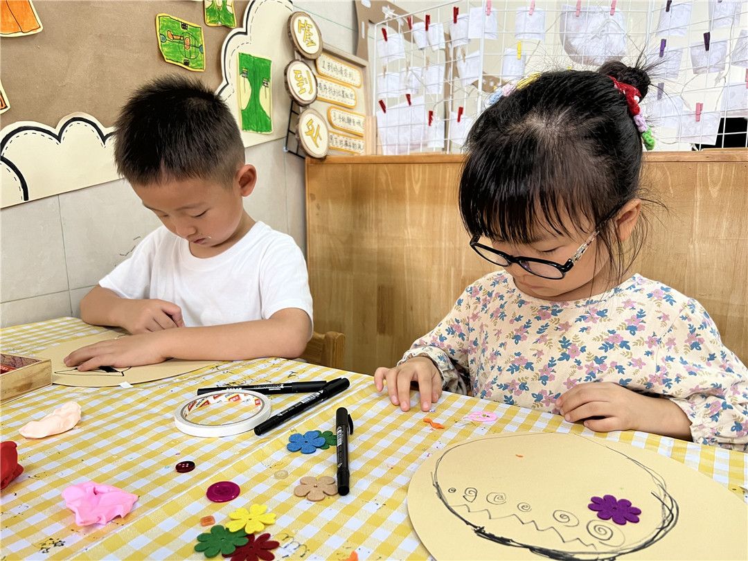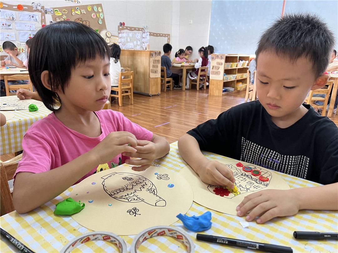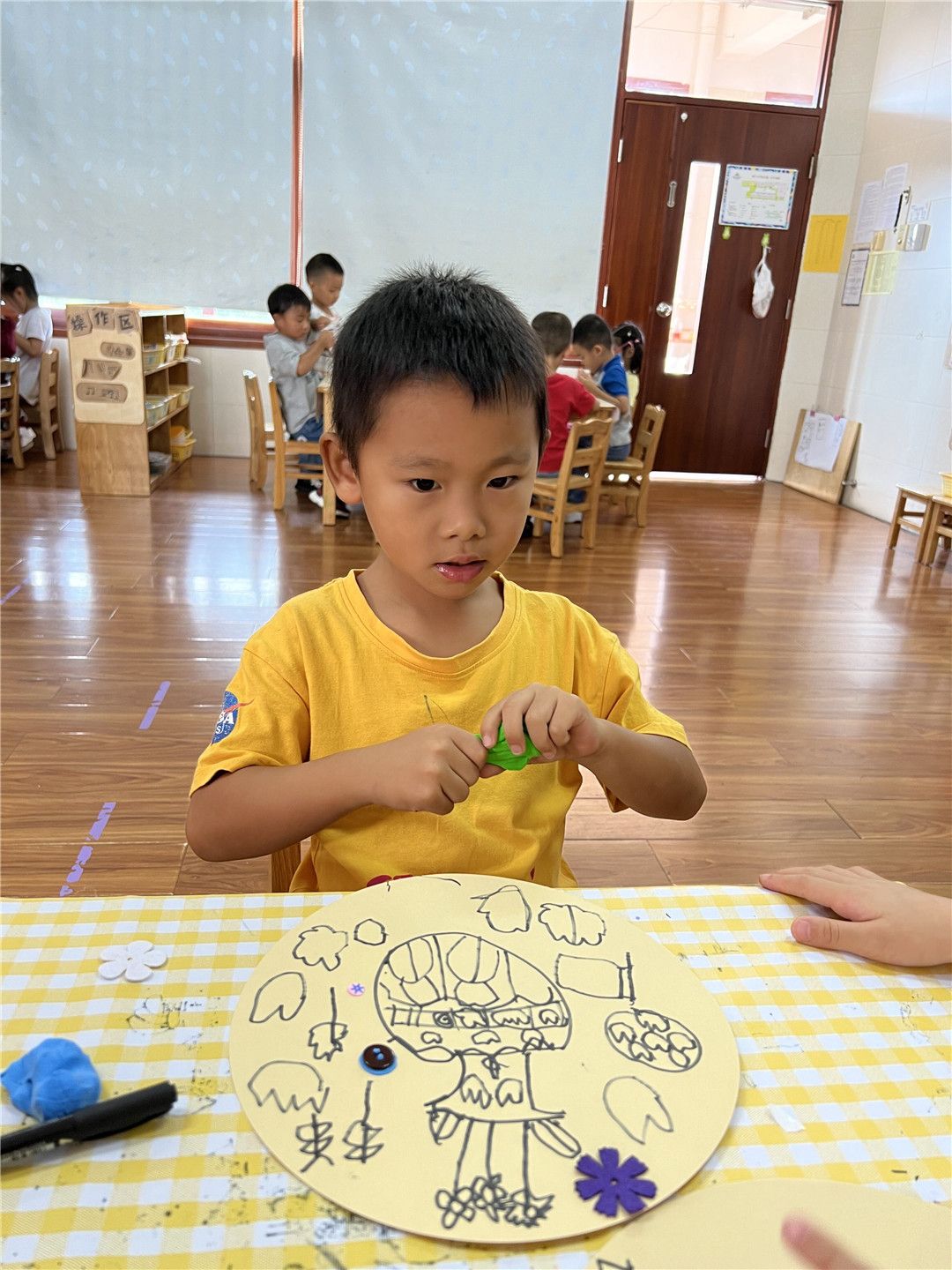 勾勒完线条,宝贝们开始选择自己喜欢的装饰材料,“我要用黏土来做小花的图案!”“我想用纽扣装饰这个三角形!”有的宝贝选择了小亮片精心点缀,有的用粘土和纽扣组合成有趣的花纹,在每位宝贝的用心制作下每一幅作品都独具色彩!