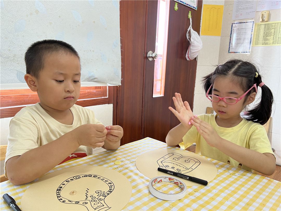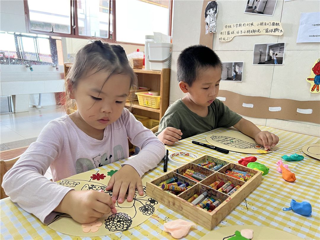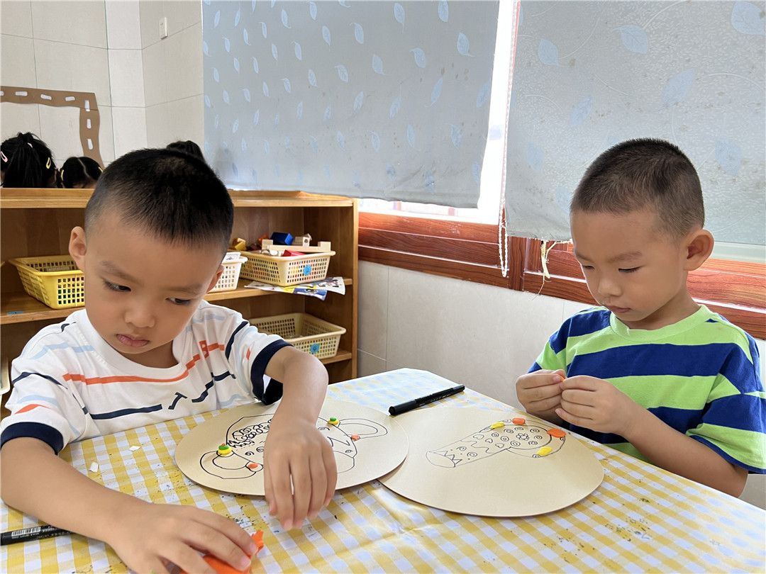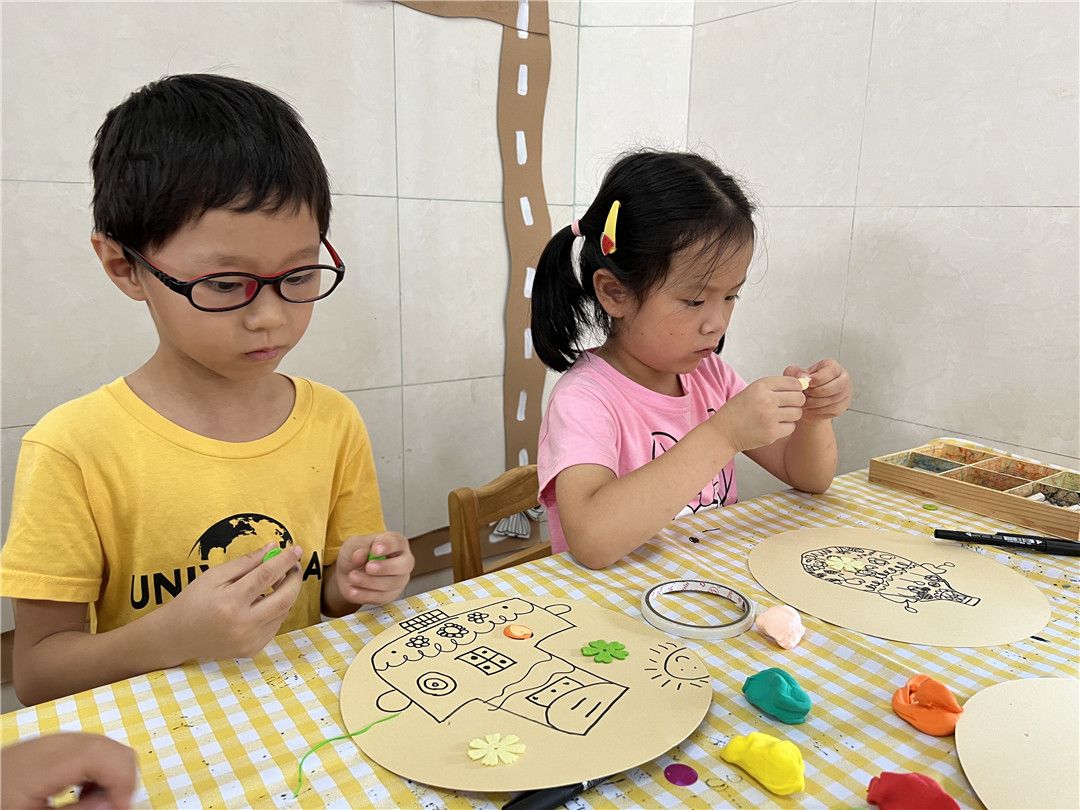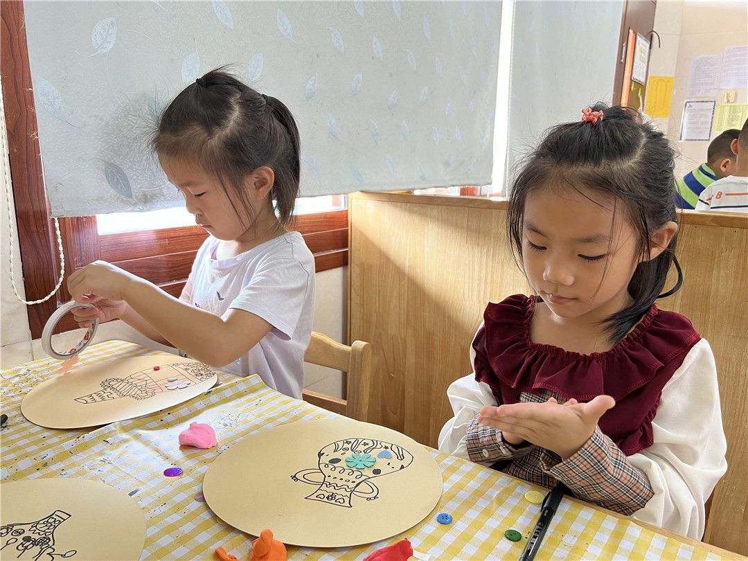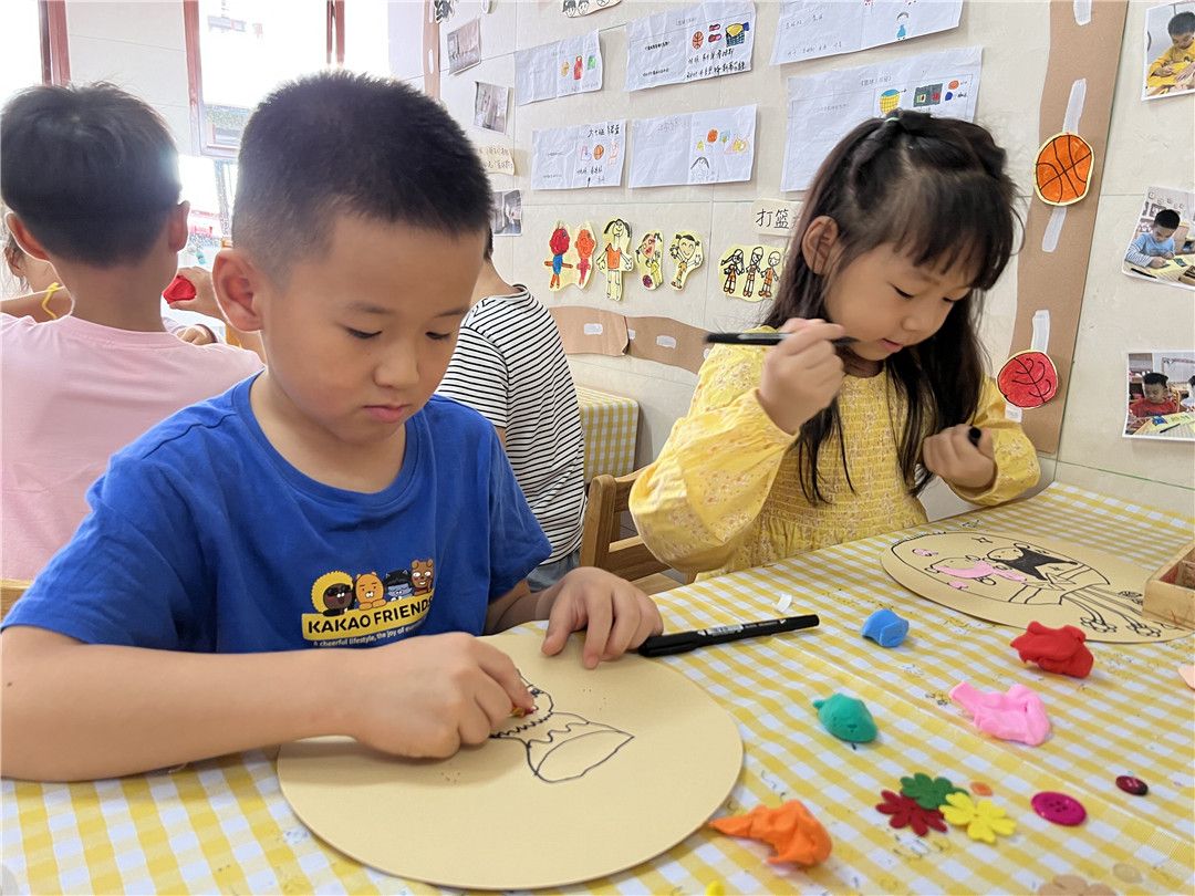 勾勒完线条,宝贝们开始选择自己喜欢的装饰材料,“我要用黏土来做小花的图案!”“我想用纽扣装饰这个三角形!”有的宝贝选择了小亮片精心点缀,有的用粘土和纽扣组合成有趣的花纹,在每位宝贝的用心制作下每一幅作品都独具色彩!