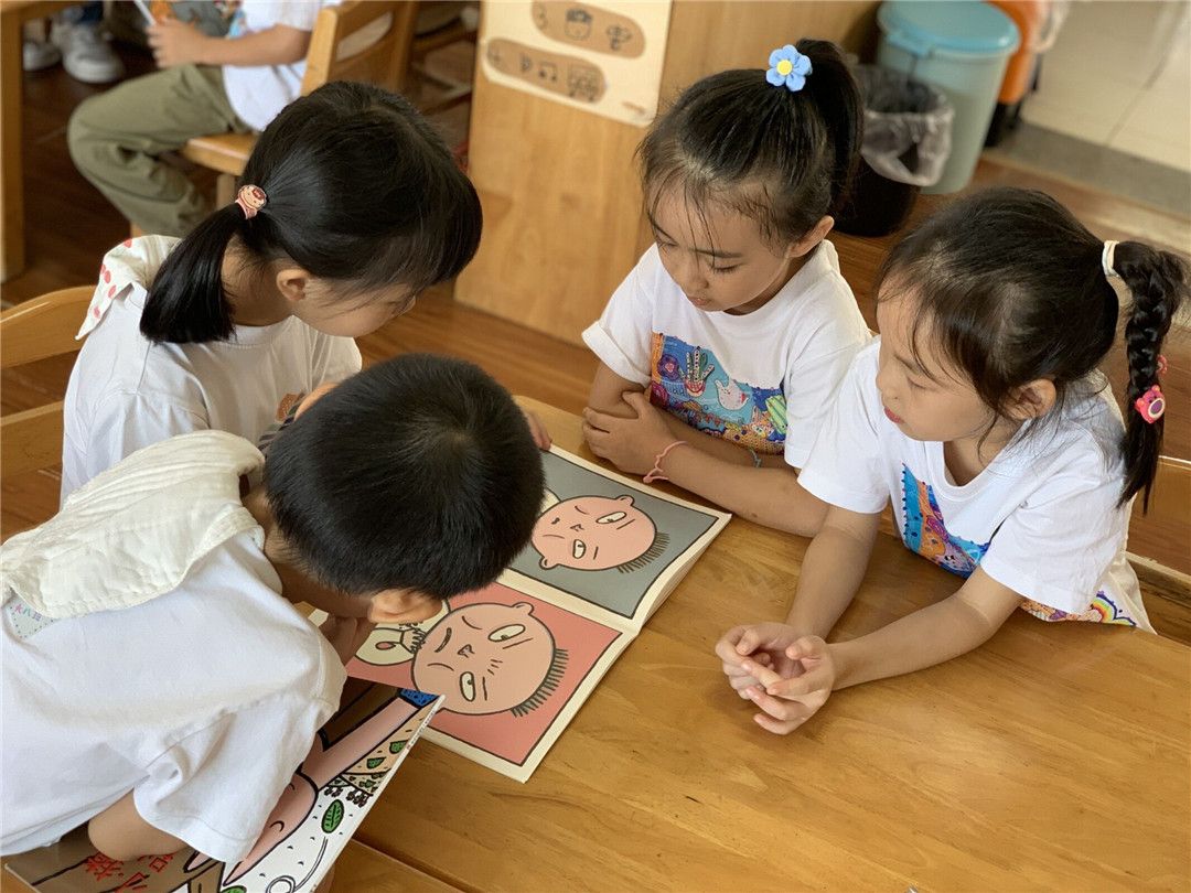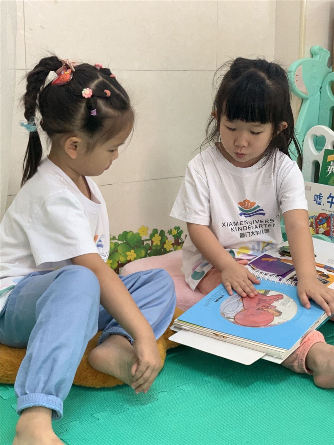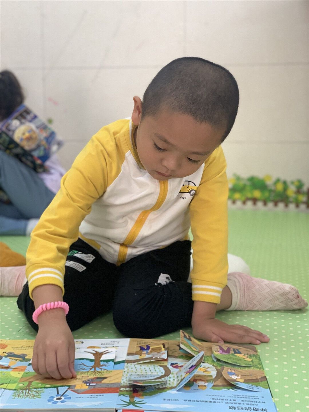 宝贝们正在安静地看着自己喜欢的绘本,小声与同伴交流,分享着自己的故事。这时候的他们,恬静、安逸,享受着阅读的乐趣。