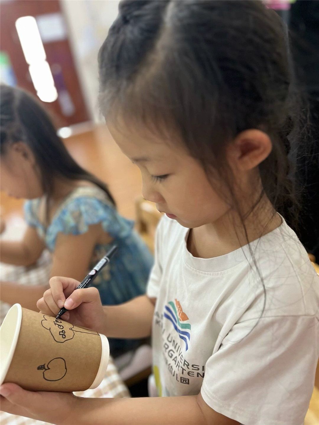 瞧,有的宝贝在用剪刀剪纸,制作中秋月饼,营造节日氛围;还有的宝贝用纸杯、马克笔,制作属于自己的水杯,专心创作的宝贝们真的太棒了!