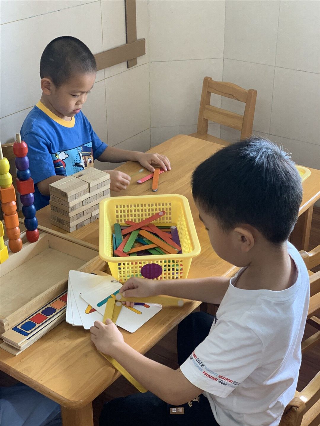 宝贝们相互合作,正专心致志的玩着拼拼乐的玩具,还有俄罗斯方块的游戏呢!可有趣啦!