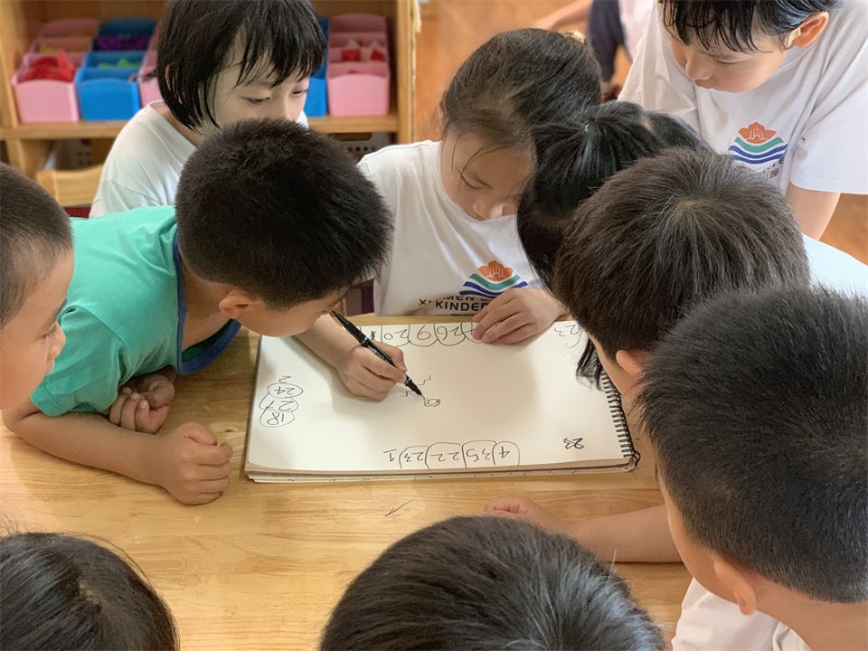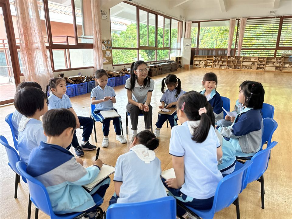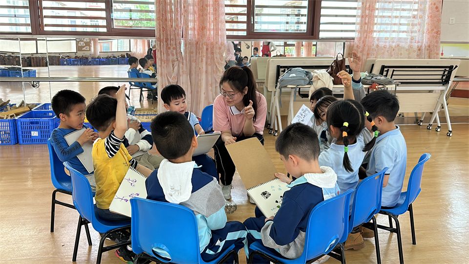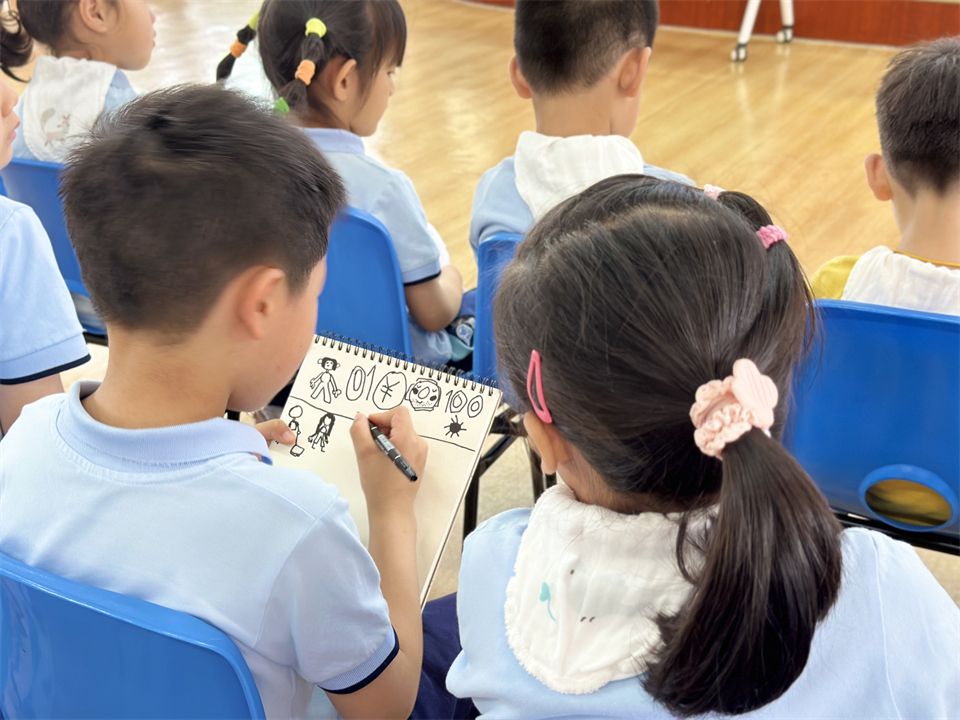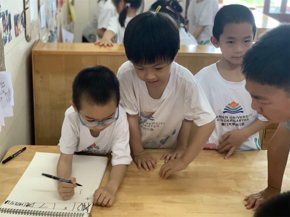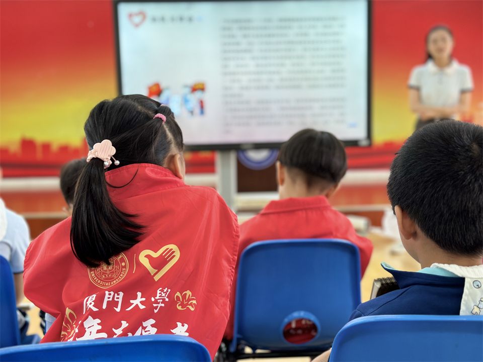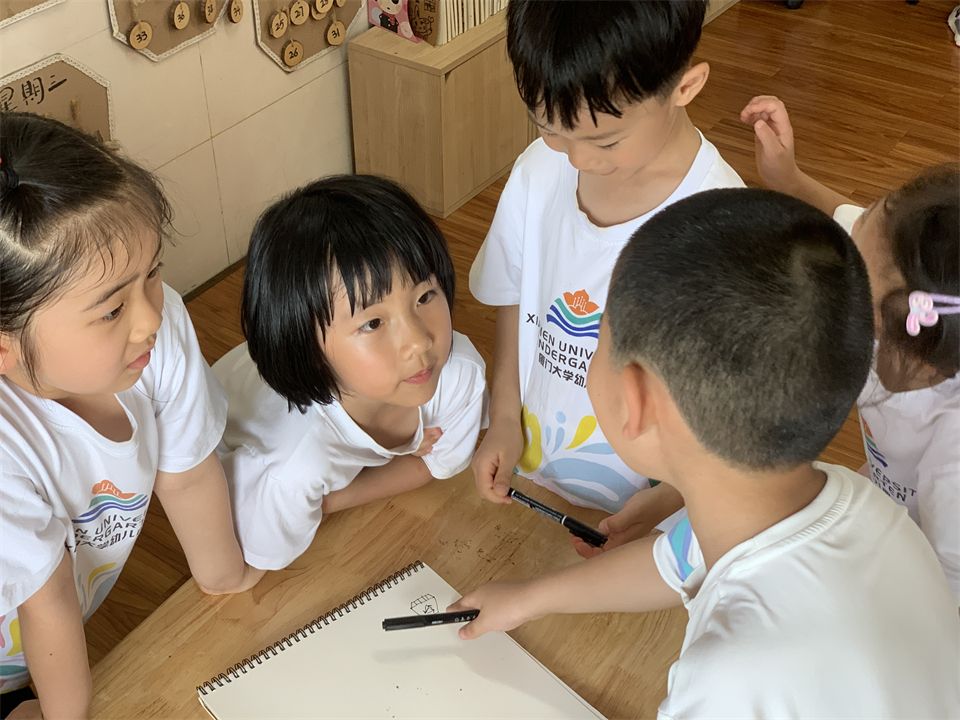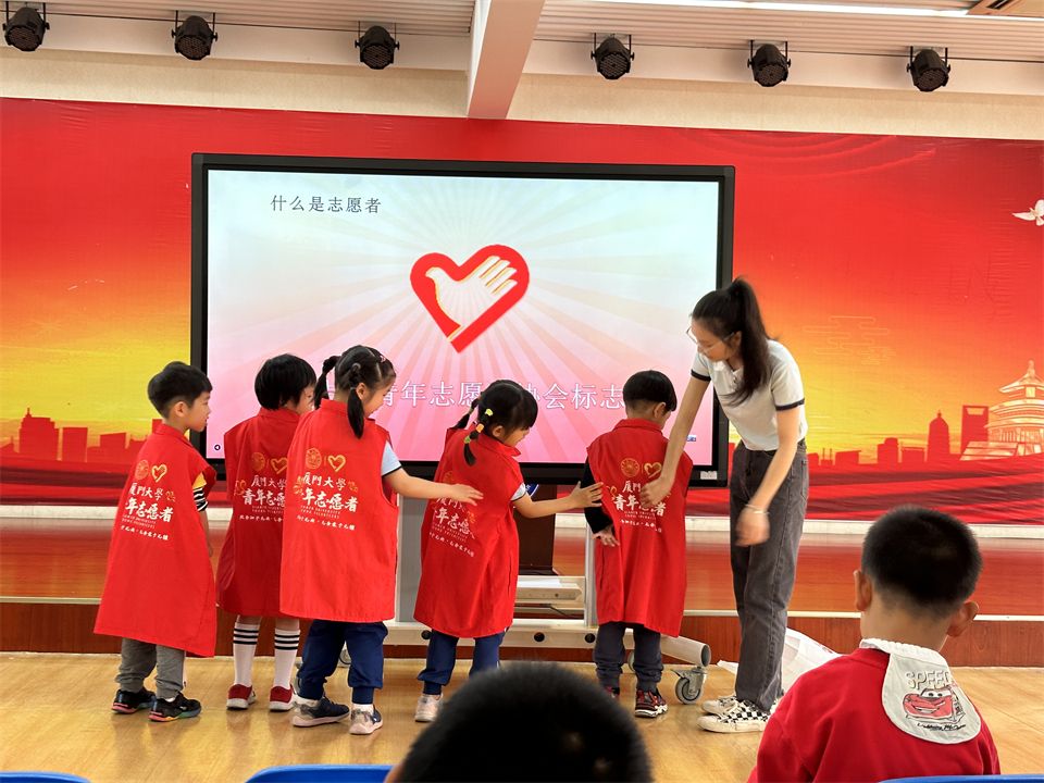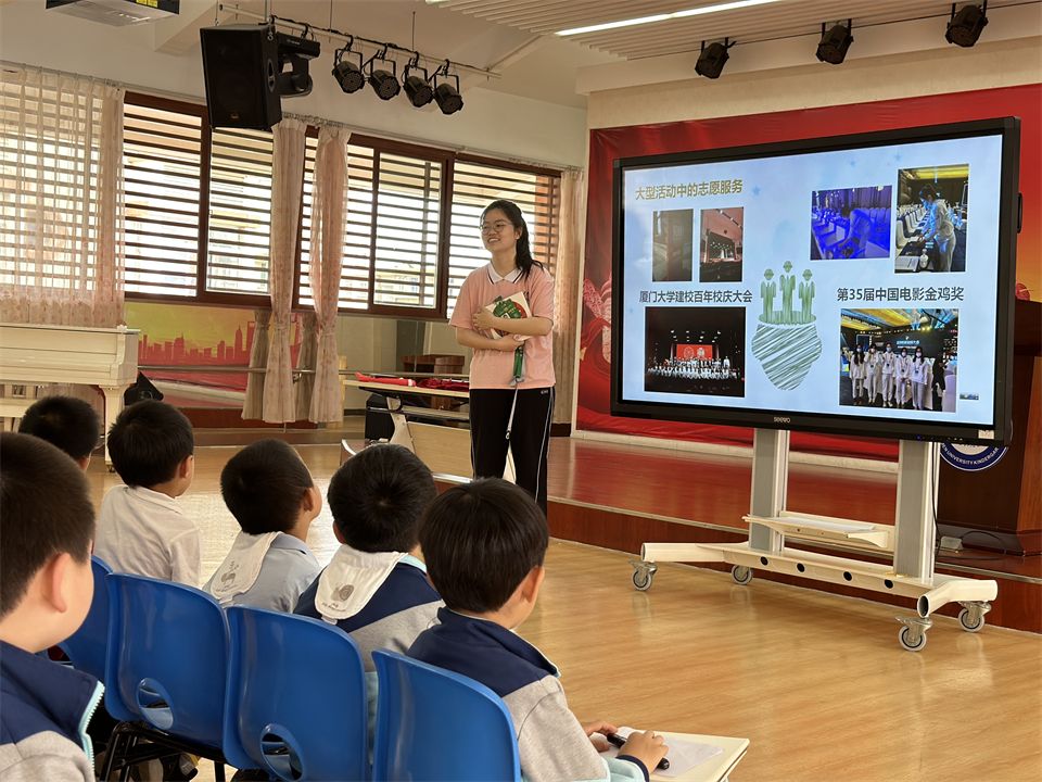 大学生志愿者分享了自己的志愿者工作经验,介绍了厦大学生志愿者的标志及吉祥物,宝贝们认真地做了记录。