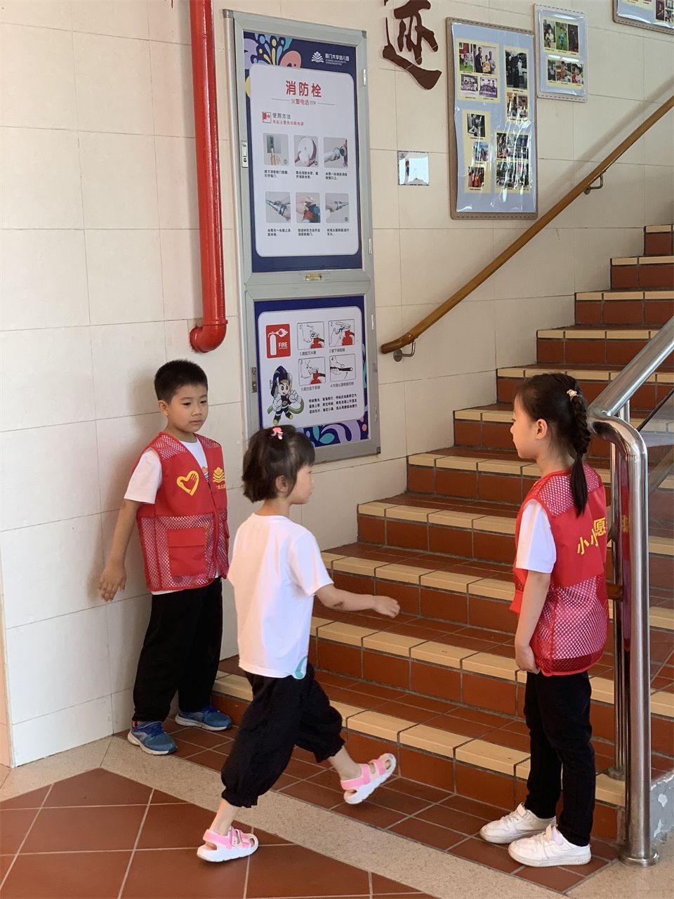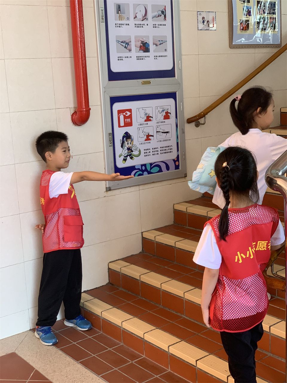 上下楼梯时,我们可以提醒弟弟妹妹们靠右走,不追逐打闹,保持距离。