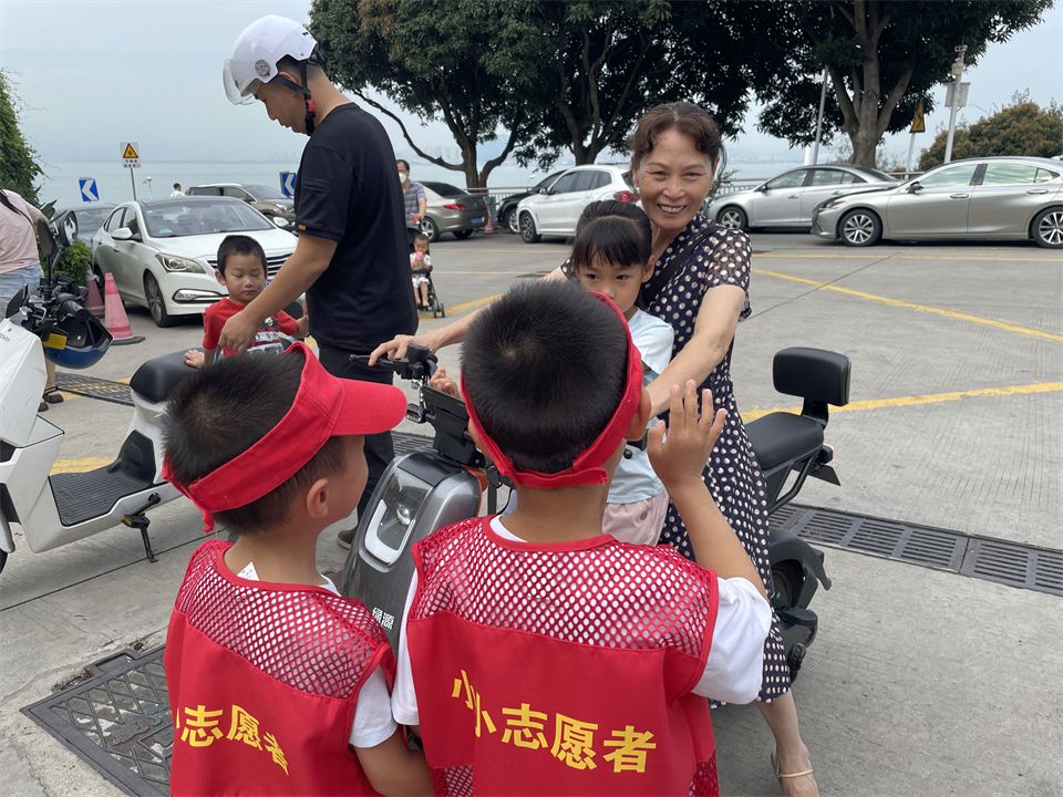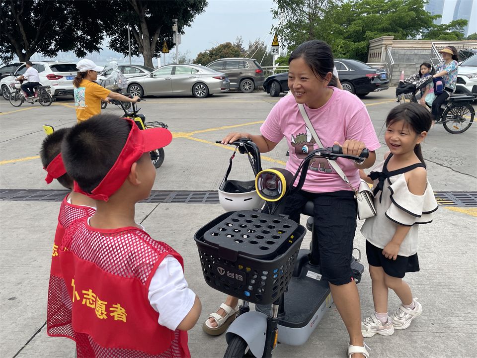 门口接送幼儿的电动车也需要“志愿者”去提醒有没有安全佩戴头盔。