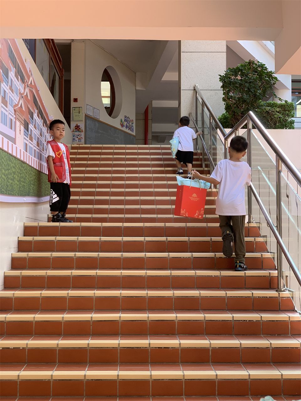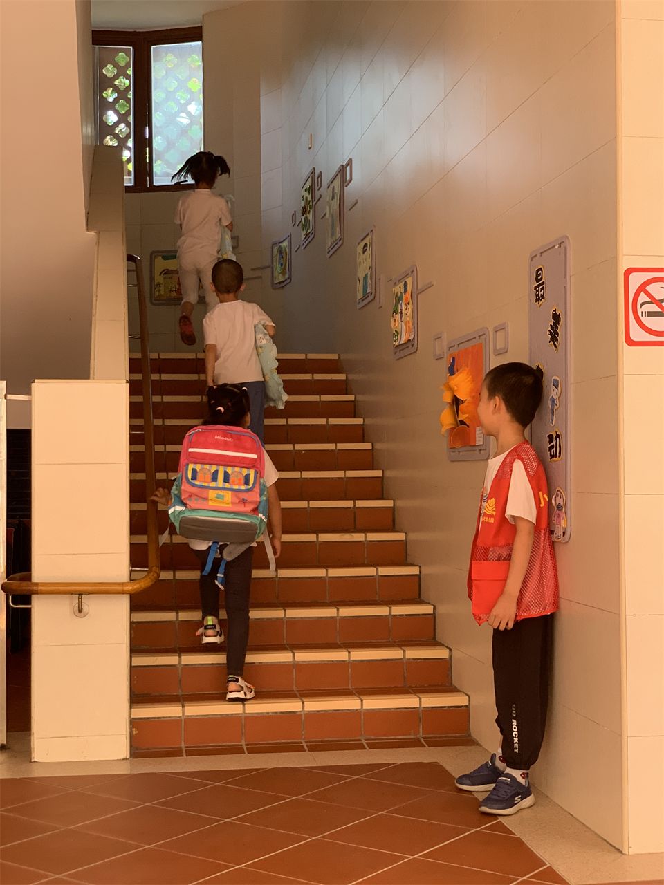 “楼梯上面好多人,小朋友们请遵守规则,扶好扶手,靠右走!”
