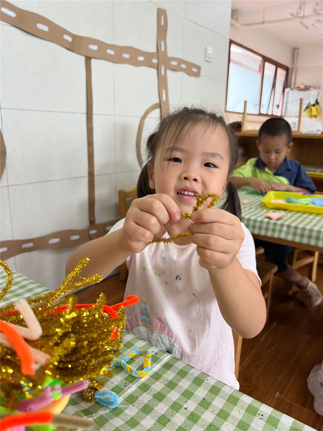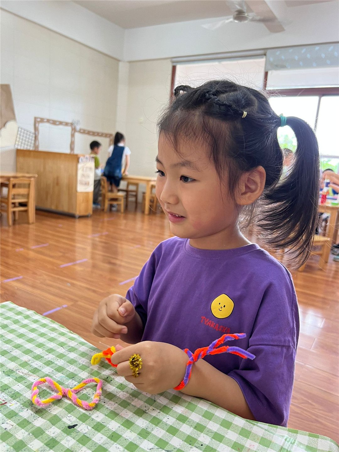 我们先来看看美工区,细心的巧手宝贝们正在制作什么呢?有五彩缤纷的手链、项链,还有好看的蛋糕、机器人……