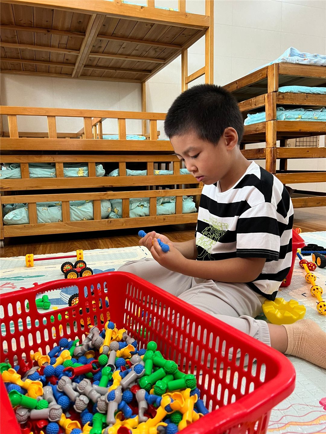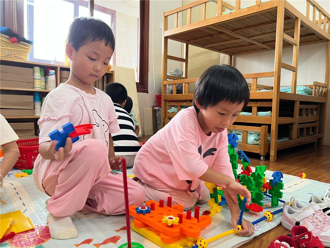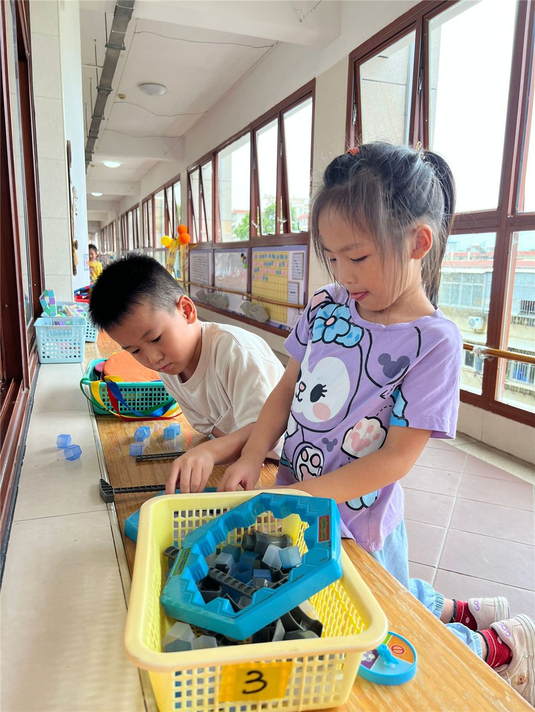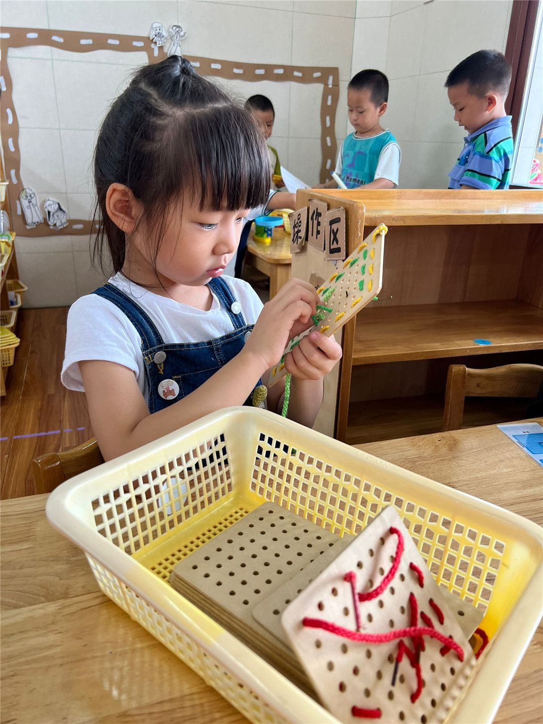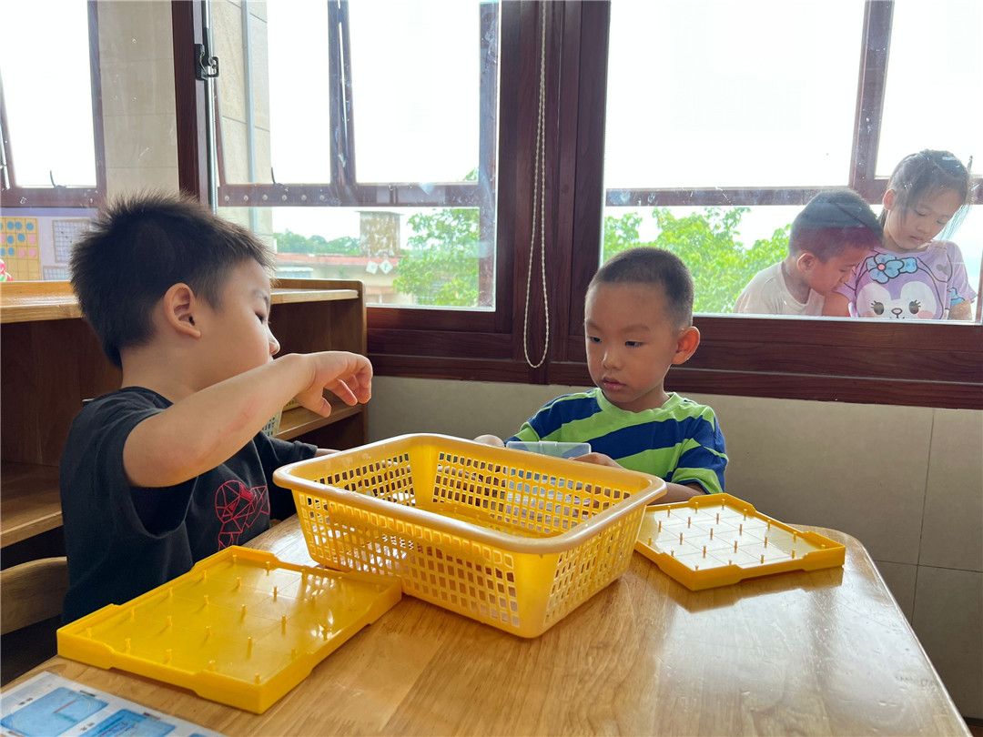 一旁的操作区也是热闹非凡,有的在试验层级轨道,有的在利用皮筋钩住钉板制作图案,有的在“穿针引线”,还有的在玩蘑菇钉拼图好看的图案,“破冰企鹅”和拼插积木也是他们的最爱……