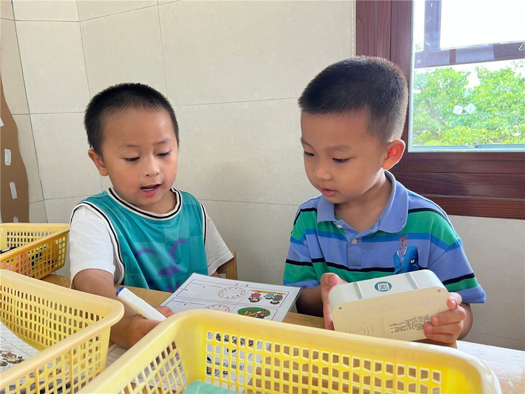 接着我们看到数学区和科学区的孩子们,他们正在专心的思考问题:“这是几点钟呀?”“这个时间应该怎么写呢?”“我来比看看谁更轻谁更重?”“这张卡片的图案放在镜子前看起来好像一只蝴蝶!”……