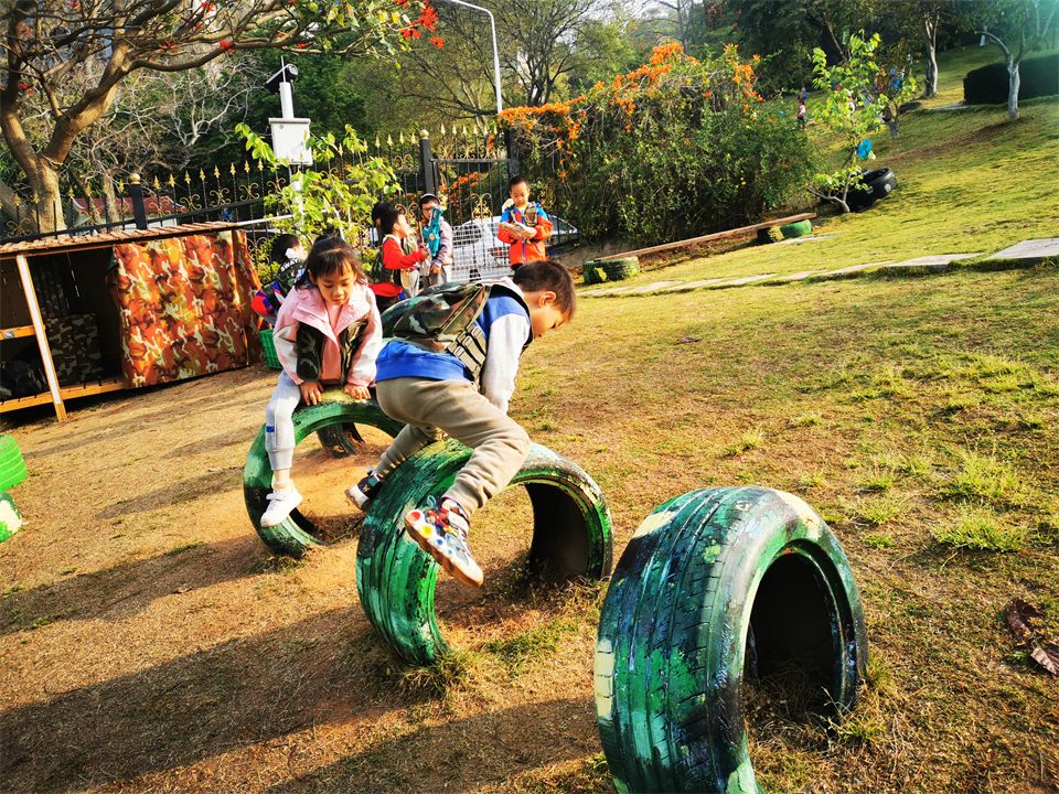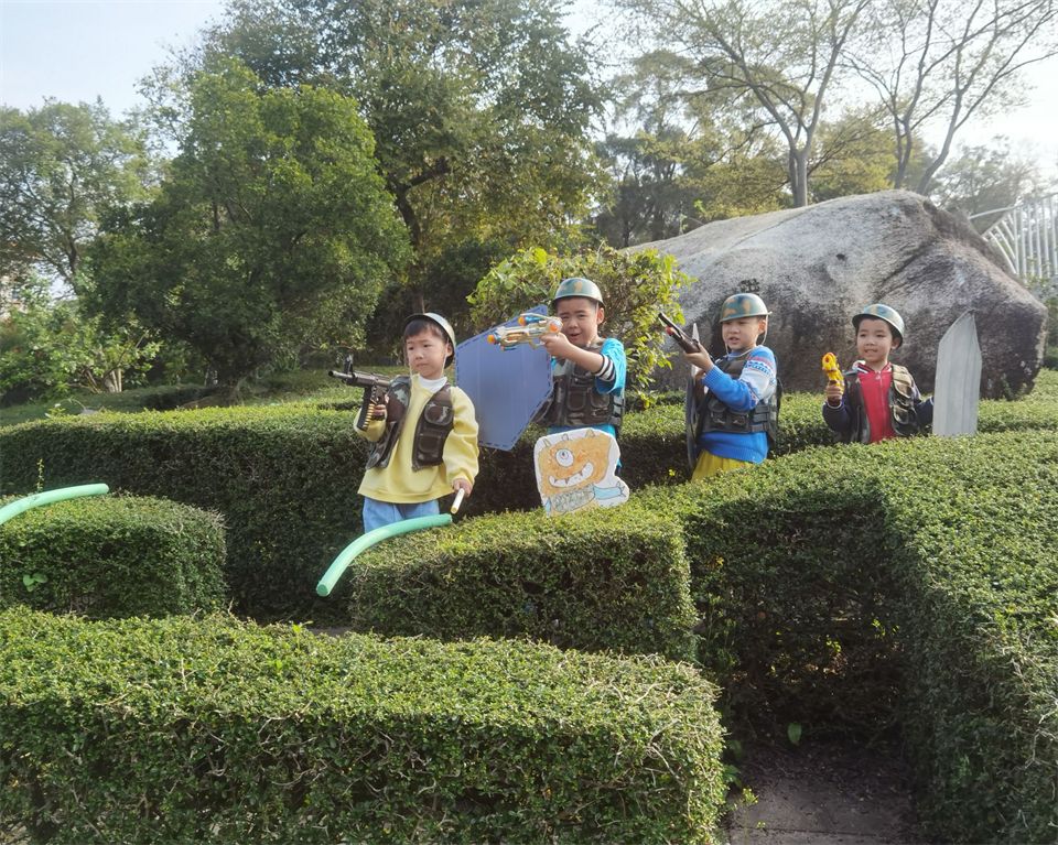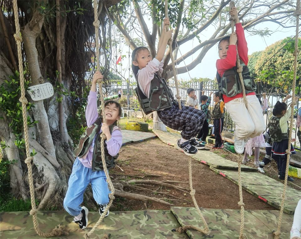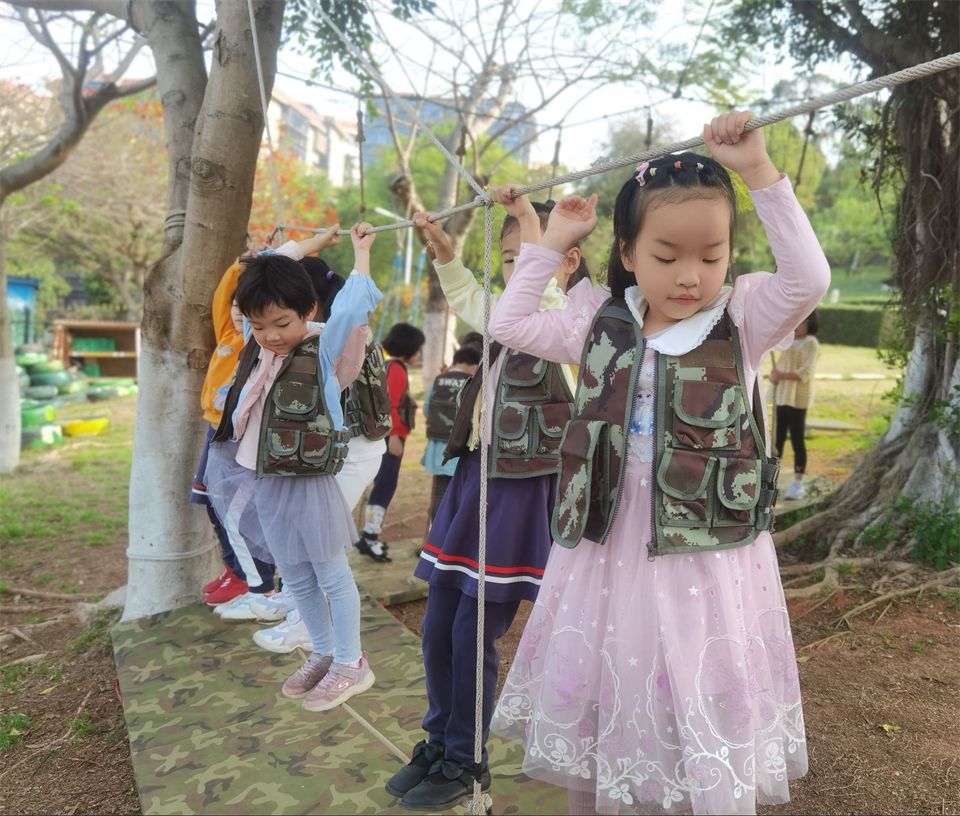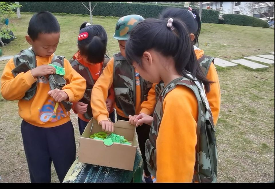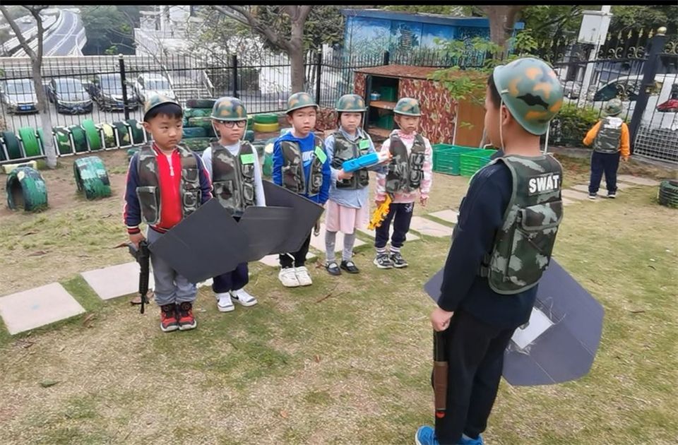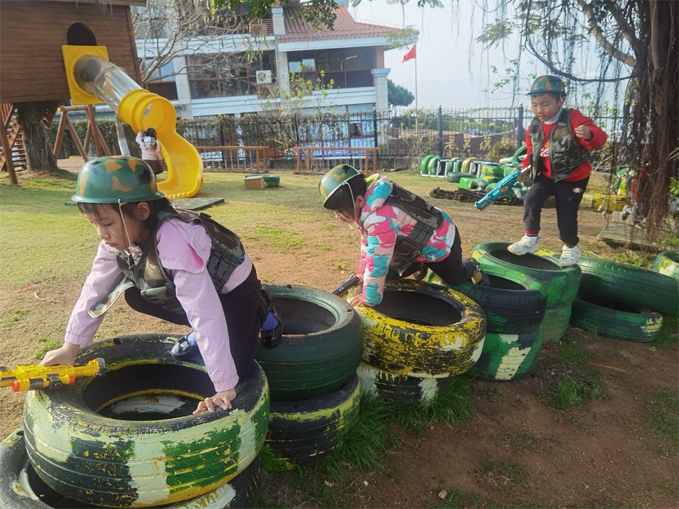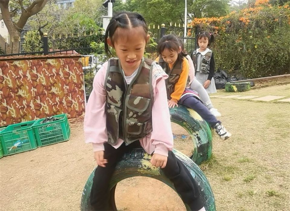 看!戴上钢盔,穿上防弹衣,手握钢枪,一切准备就绪,小队长带着自己的小兵出发拉练啦。韬韬队长一边带着队员寻找合适的路线,一边不忘提醒小伙伴:“大家要小心,不要掉下去啦!”“杉杉你踩着轮胎这里,比较安全哦。”小兵们一个接着一个小心翼翼地踩在轮胎上,走过荡荡桥,检查着大炮。雅雅队长者带着队员跳过石板路,爬过轮胎山、钻过小洞,拉练训练正在紧张而有序地进行着。