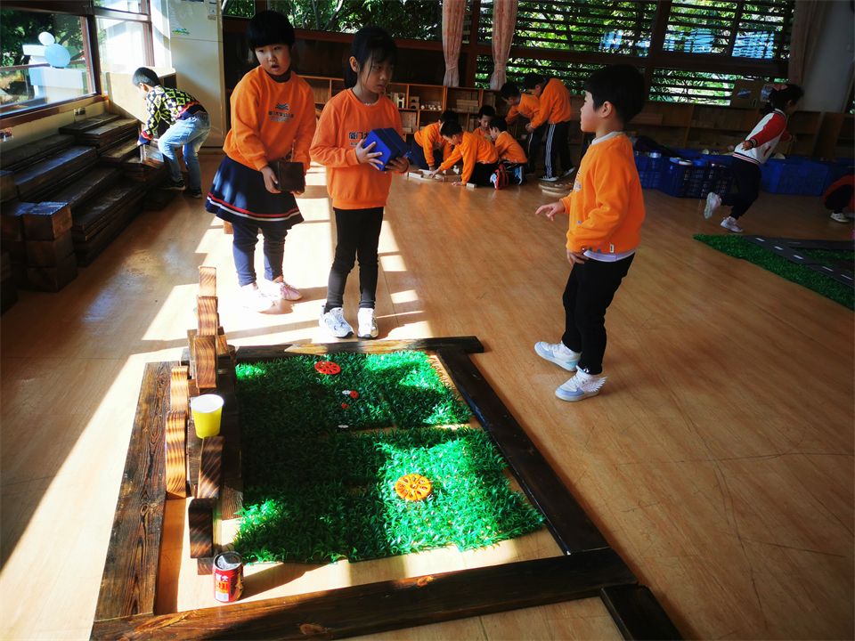 建构游戏室里好热闹呀!来看看“搬砖”工地, 各种围合、各种拼插、各种加工、各种垒高,热闹非凡!“这是厦大南门,这里有保安岗亭、还有摄像头。”