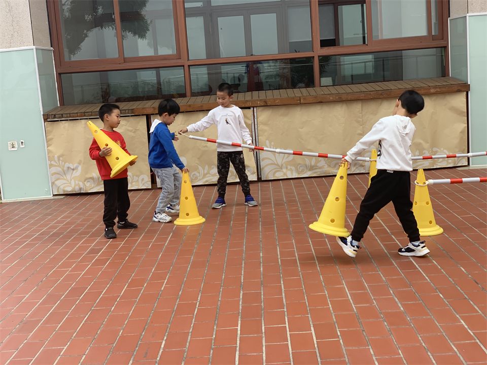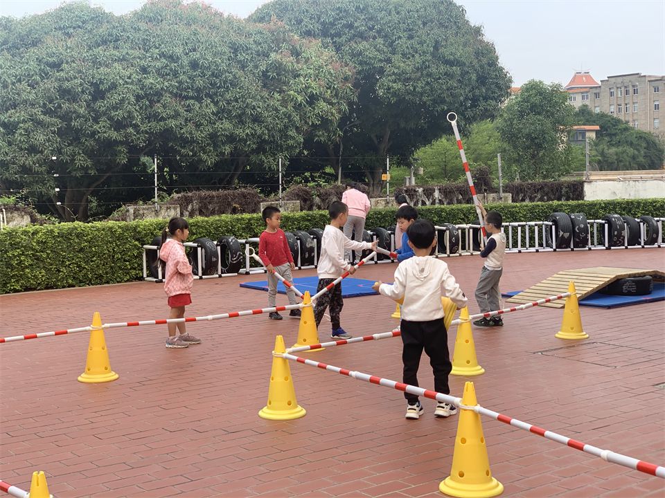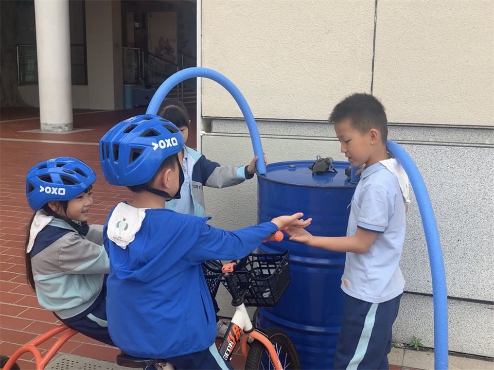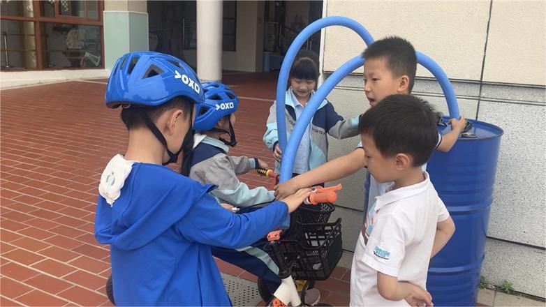 和朋友商量好的屿洵、明睿、宸玥跑到了油桶旁连接水管开始了加油游戏,其他孩子们看到了也纷纷开来了小车加油。