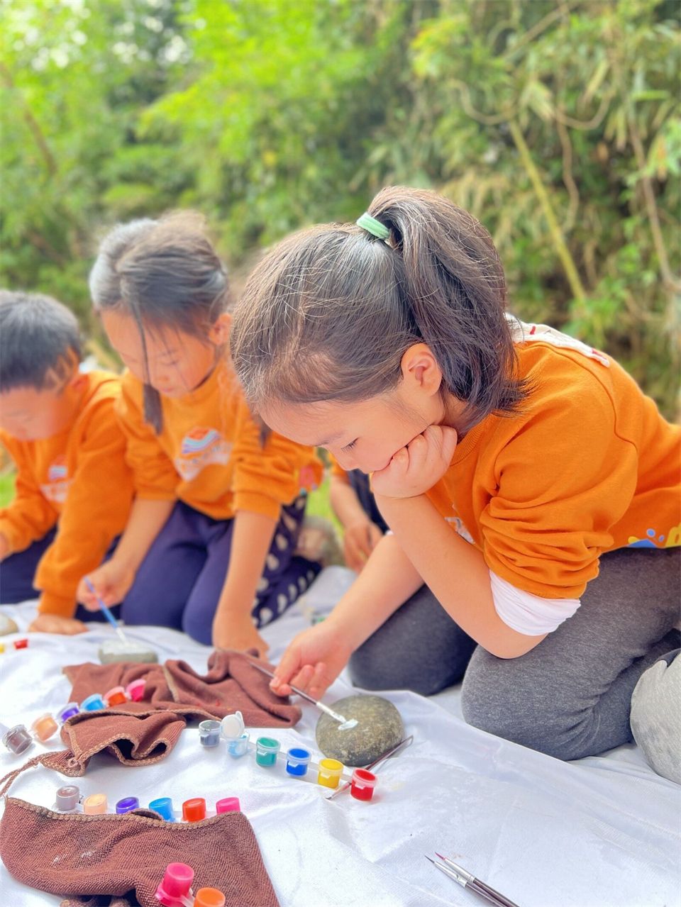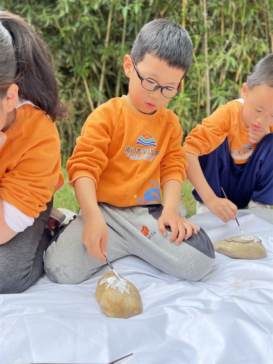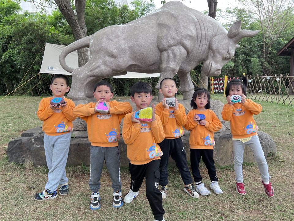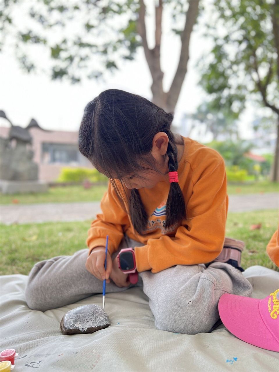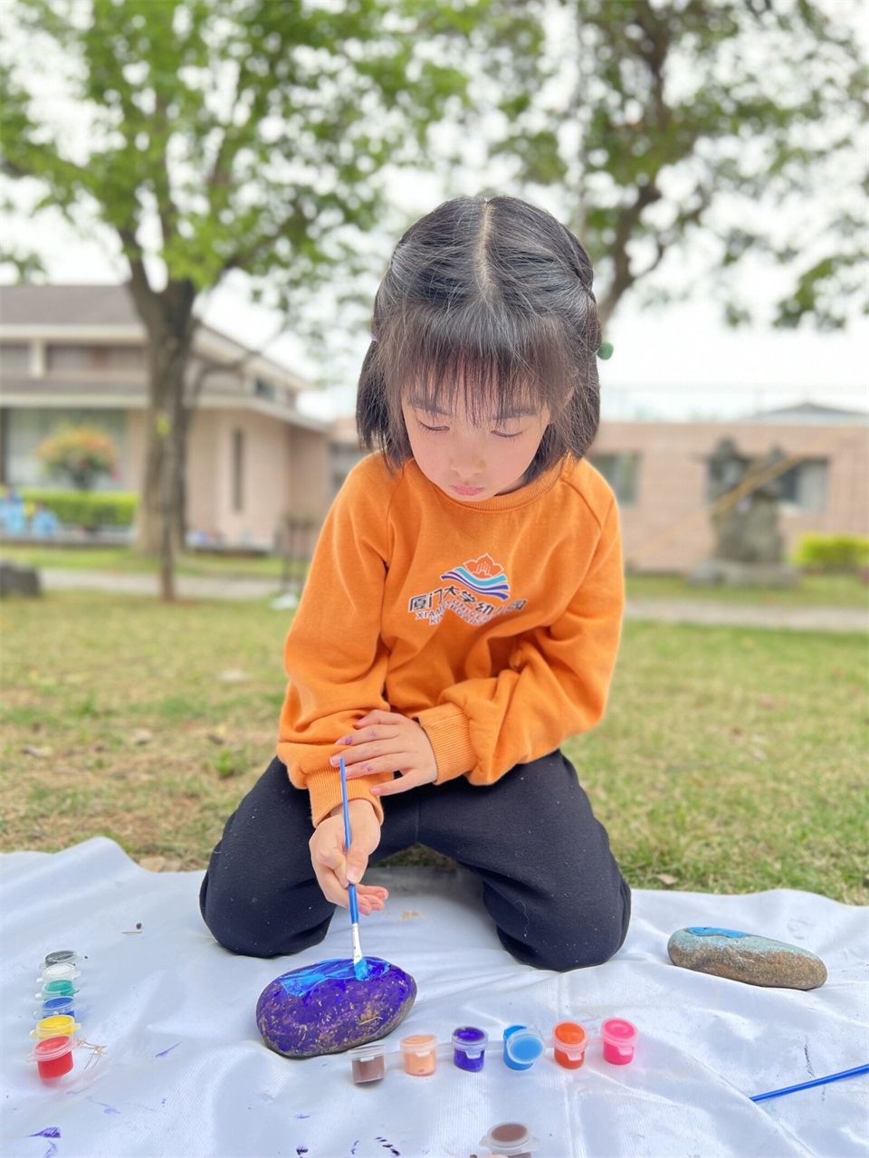参观完博物馆后,宝贝们跟随着老师寻找大自然中的石头,根据捡拾到的石头外形特点进行丰富联想,拿起画笔在石头上进行彩绘,不一会儿,一个个石头彩绘艺术品就呈现在大家的眼前。