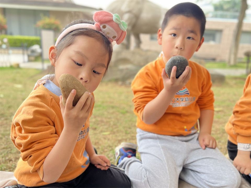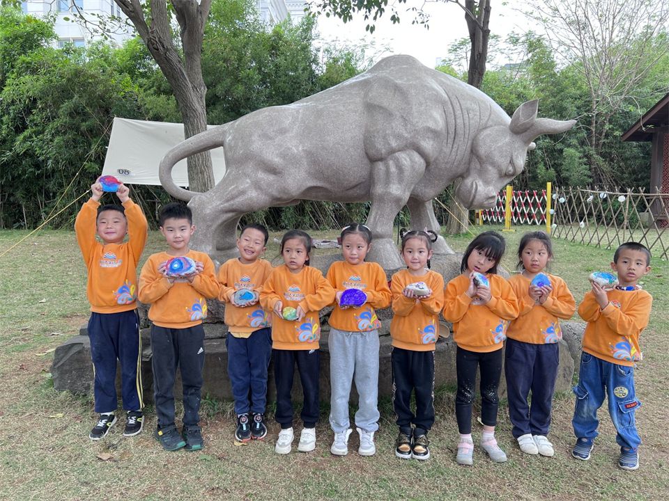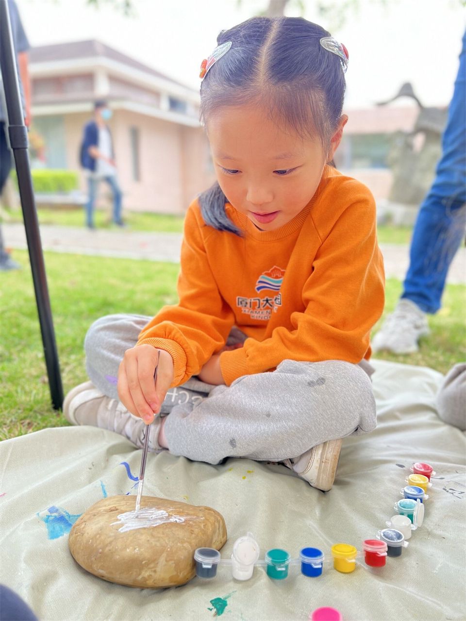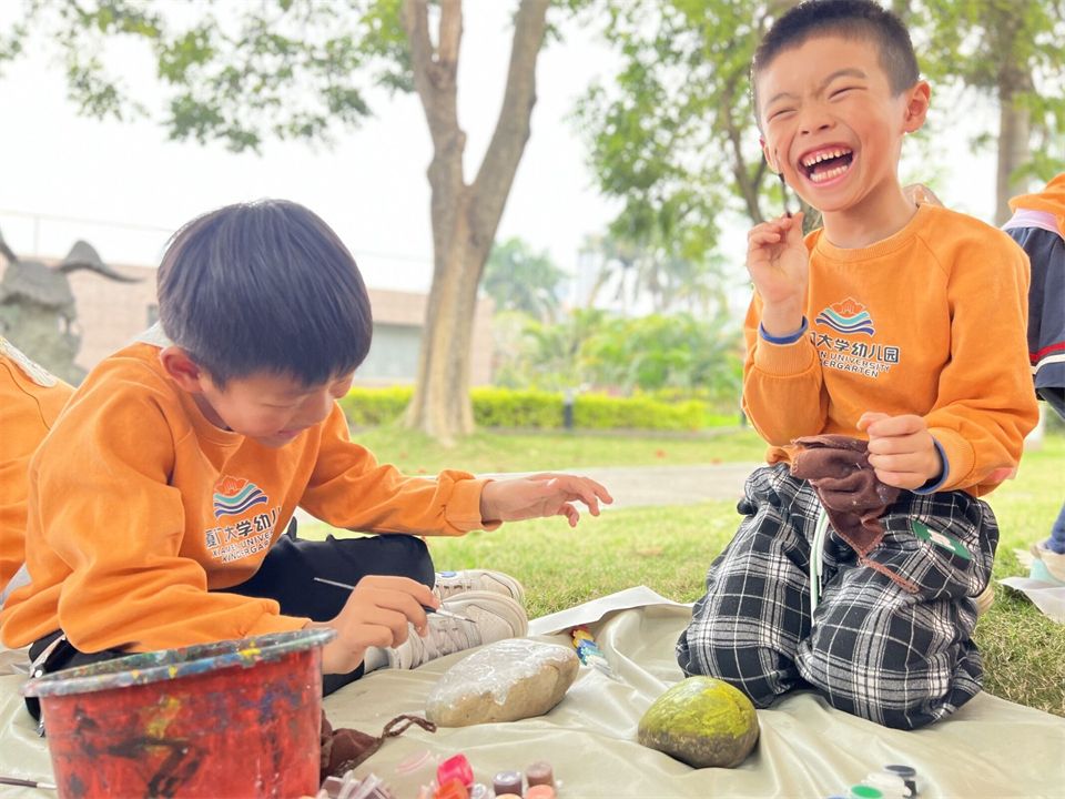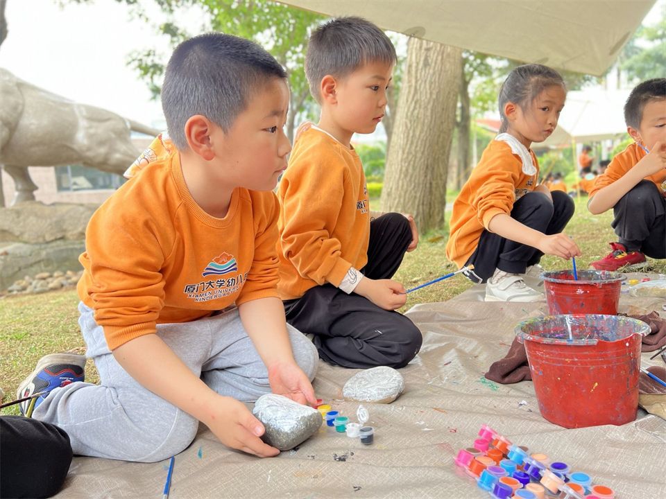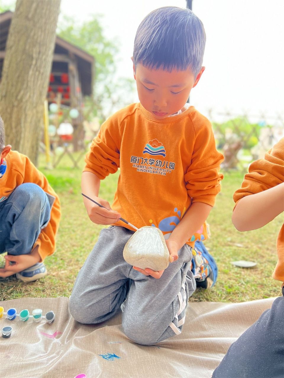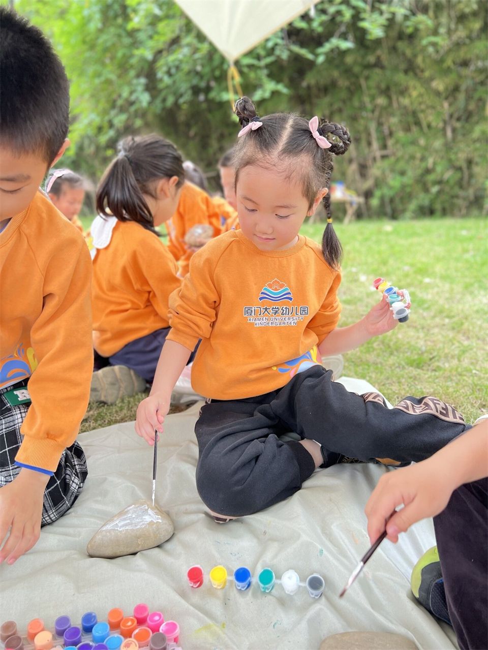 参观完博物馆后,宝贝们跟随着老师寻找大自然中的石头,根据捡拾到的石头外形特点进行丰富联想,拿起画笔在石头上进行彩绘,不一会儿,一个个石头彩绘艺术品就呈现在大家的眼前。