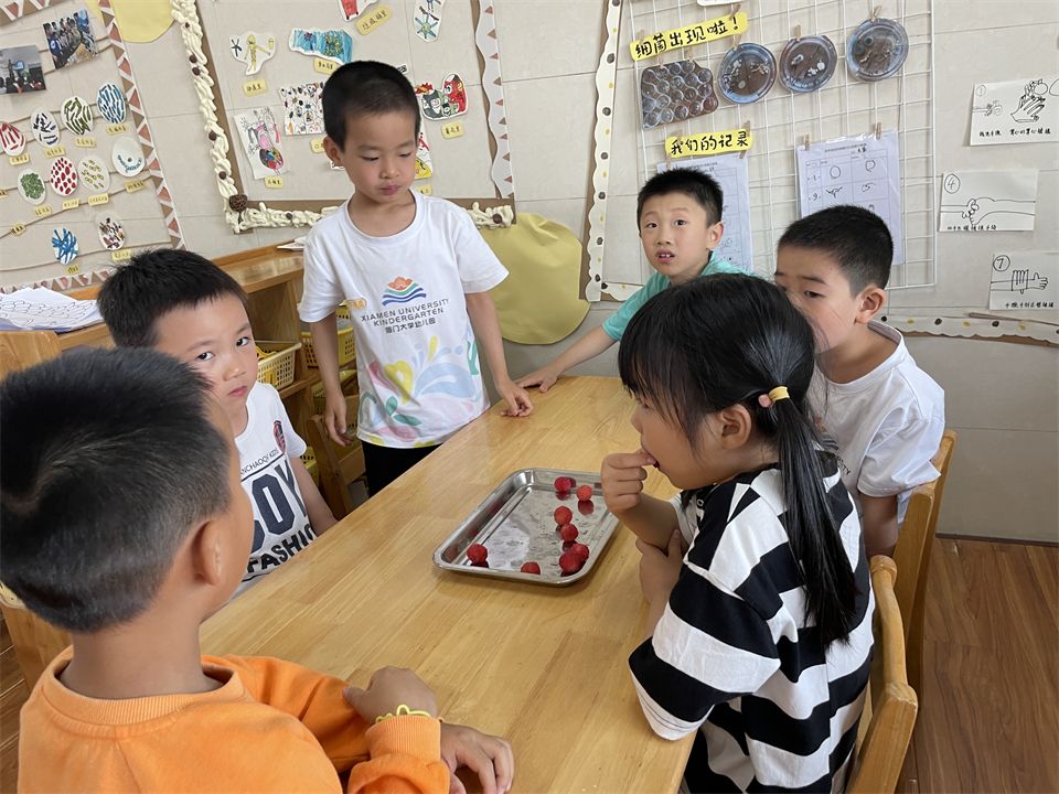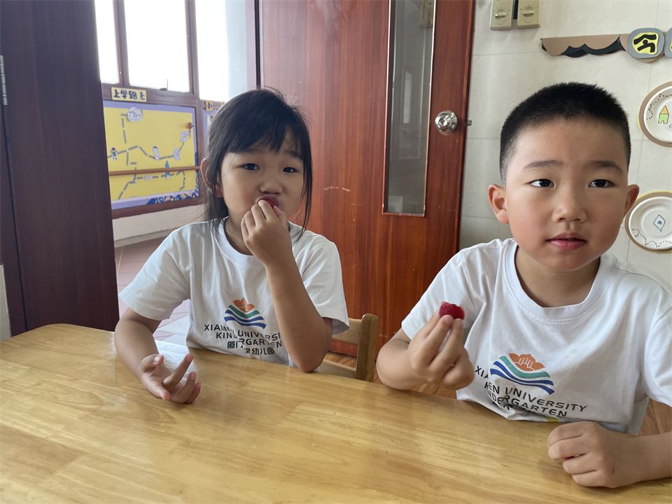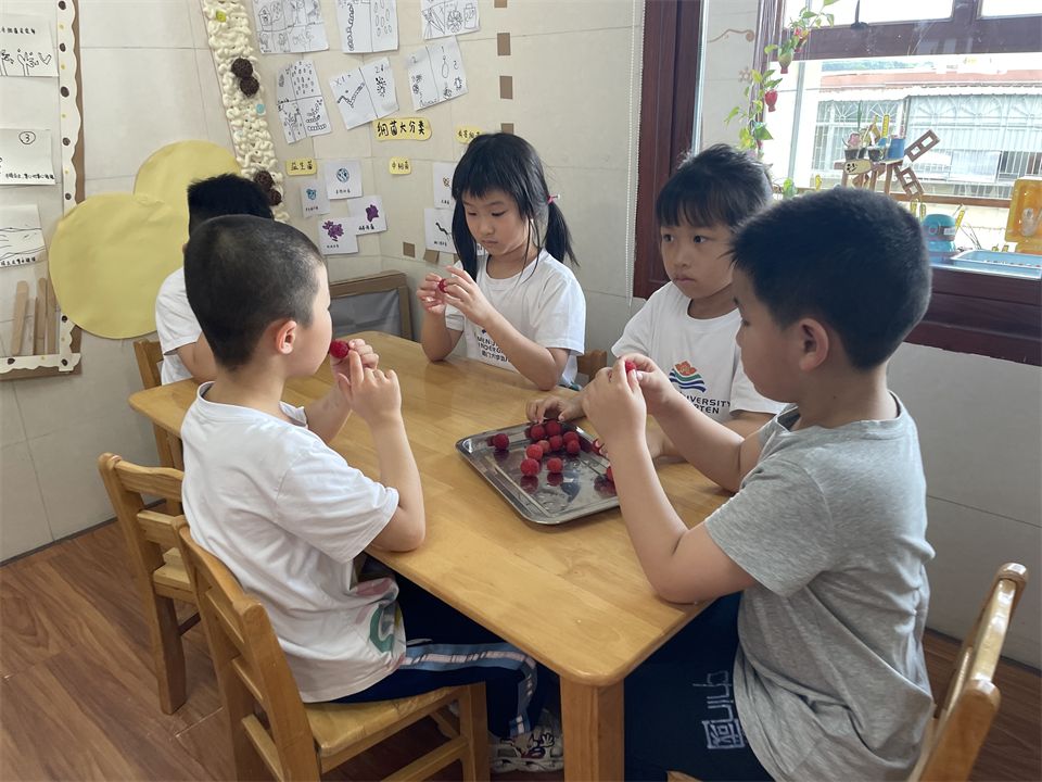 接下来就是激动人心的品尝环节,老师将杨梅放到事先准备好的盐水中浸泡,清洗干净后分发给孩子们品尝。孩子们拿起一颗杨梅送入口中,瞬间爆出超多果汁,满口都是清新的果香,一直甜上心头,仿佛一口吃到了整个夏天的甜蜜,满足感油然而生。这样的快乐,只