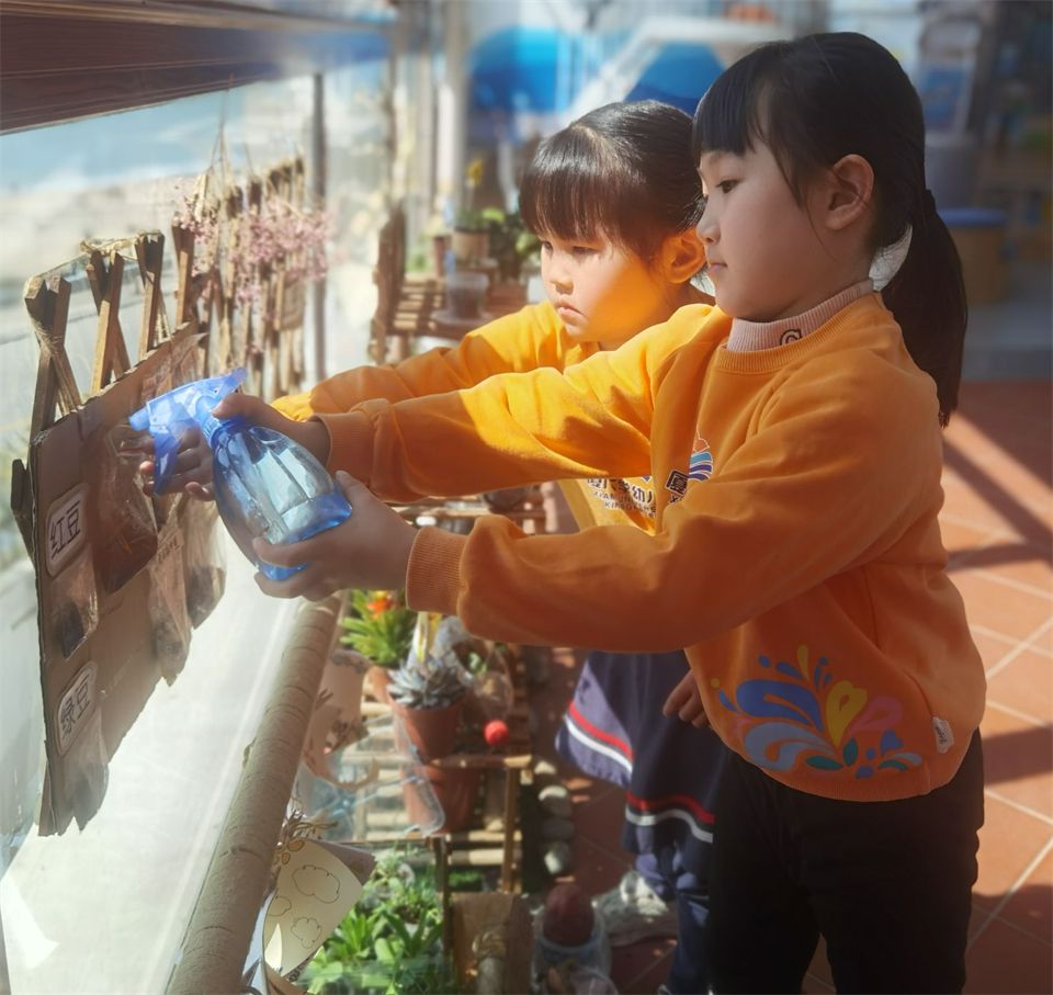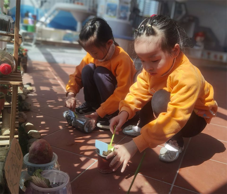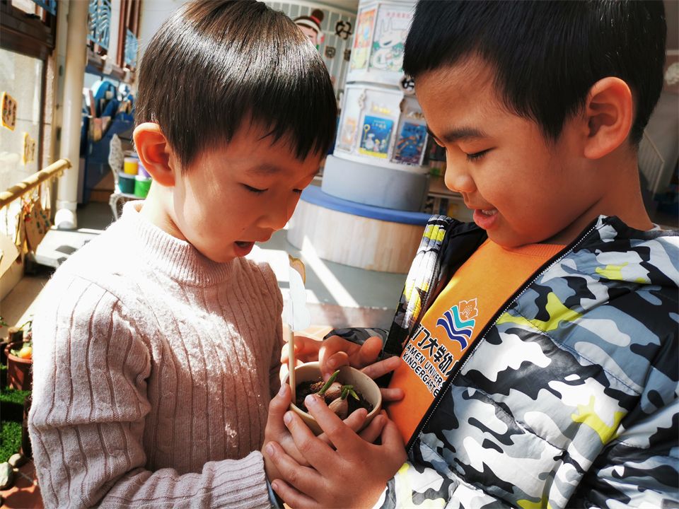 开始种植啦!我们装点儿土,挖个坑,将种子种进去,再浇浇水, 在这春暖花开的日子里,每天都期待自然角带给我们的惊喜:哪颗小种子已破土而出?哪朵小花含苞待放?我们有了新的发现?遇到的新的问题?