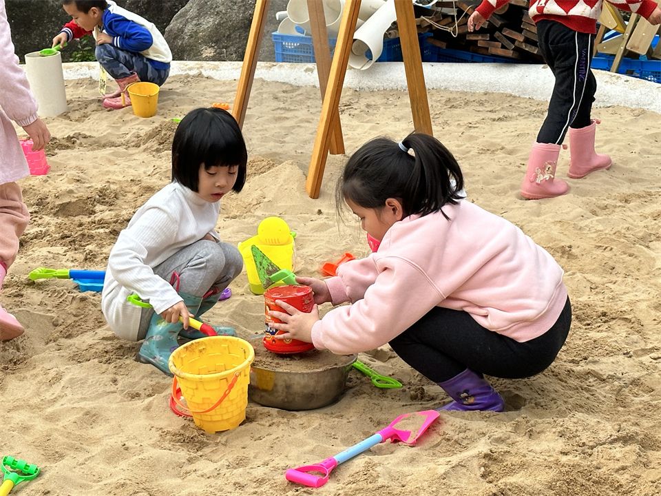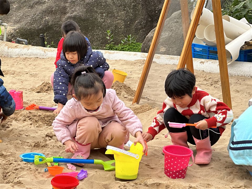 看!宝贝们挖呀挖,弯弯绕绕的每一条通道都从四面八方连接了起来,好朋友们一起来合作,你在前、我在后,不知不觉竟然建造成了一座巨大的迷宫。
