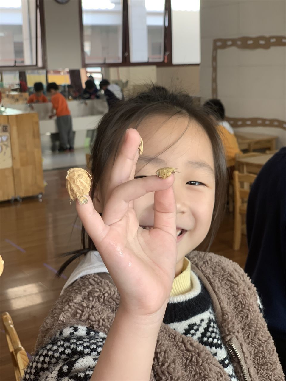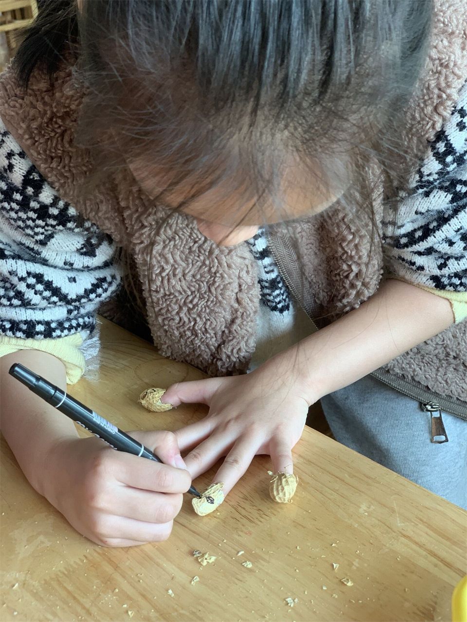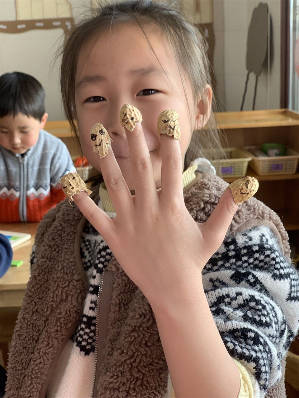 花生壳也被孩子们玩出了新花样,套到指尖变成了独一无二的美甲,加上表情就是花生指偶,直接可以表演故事了,真是太有趣了。