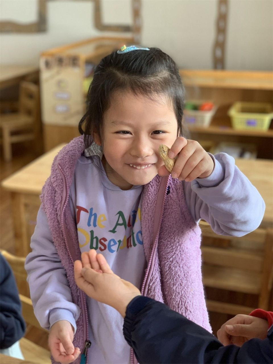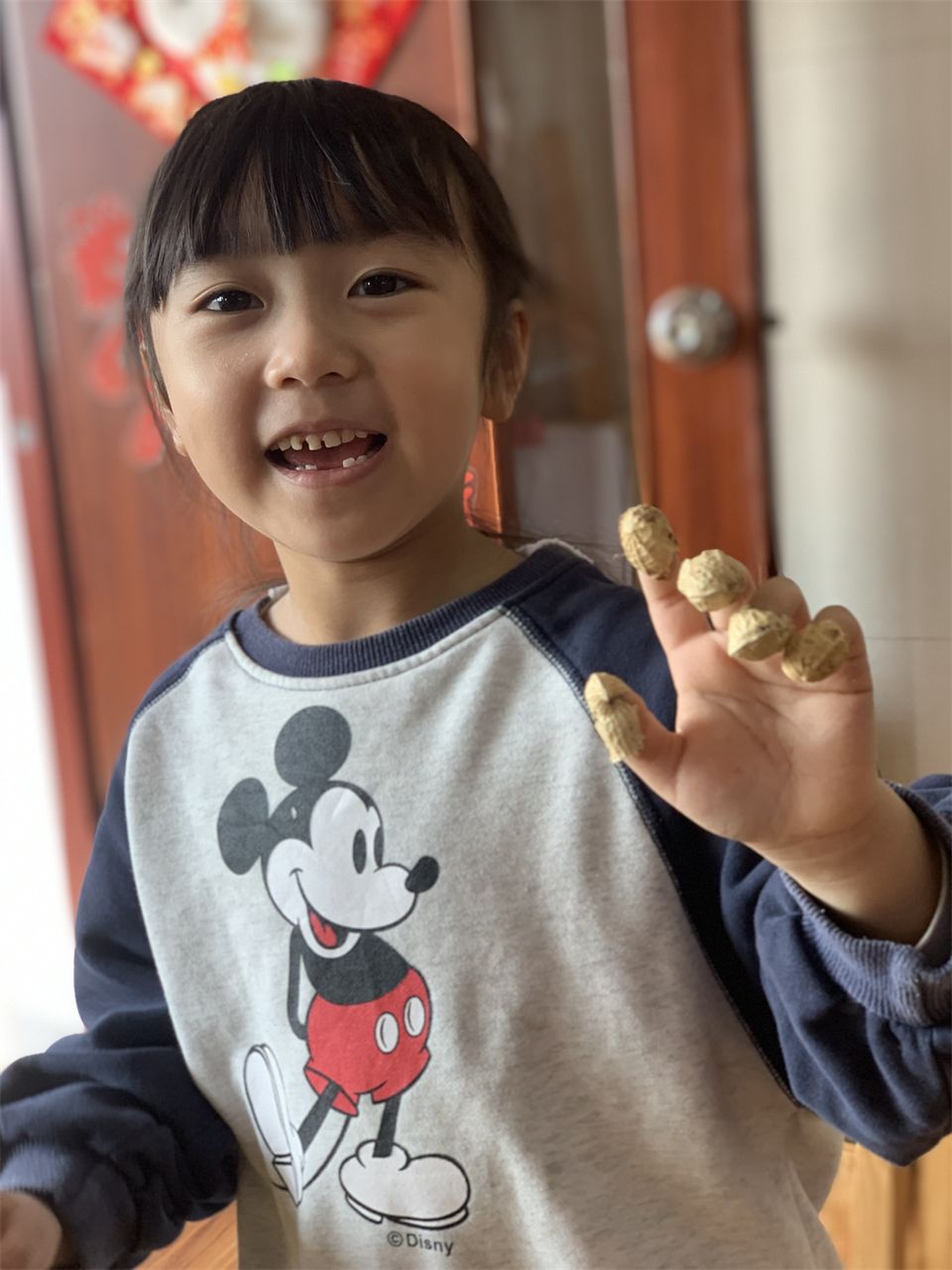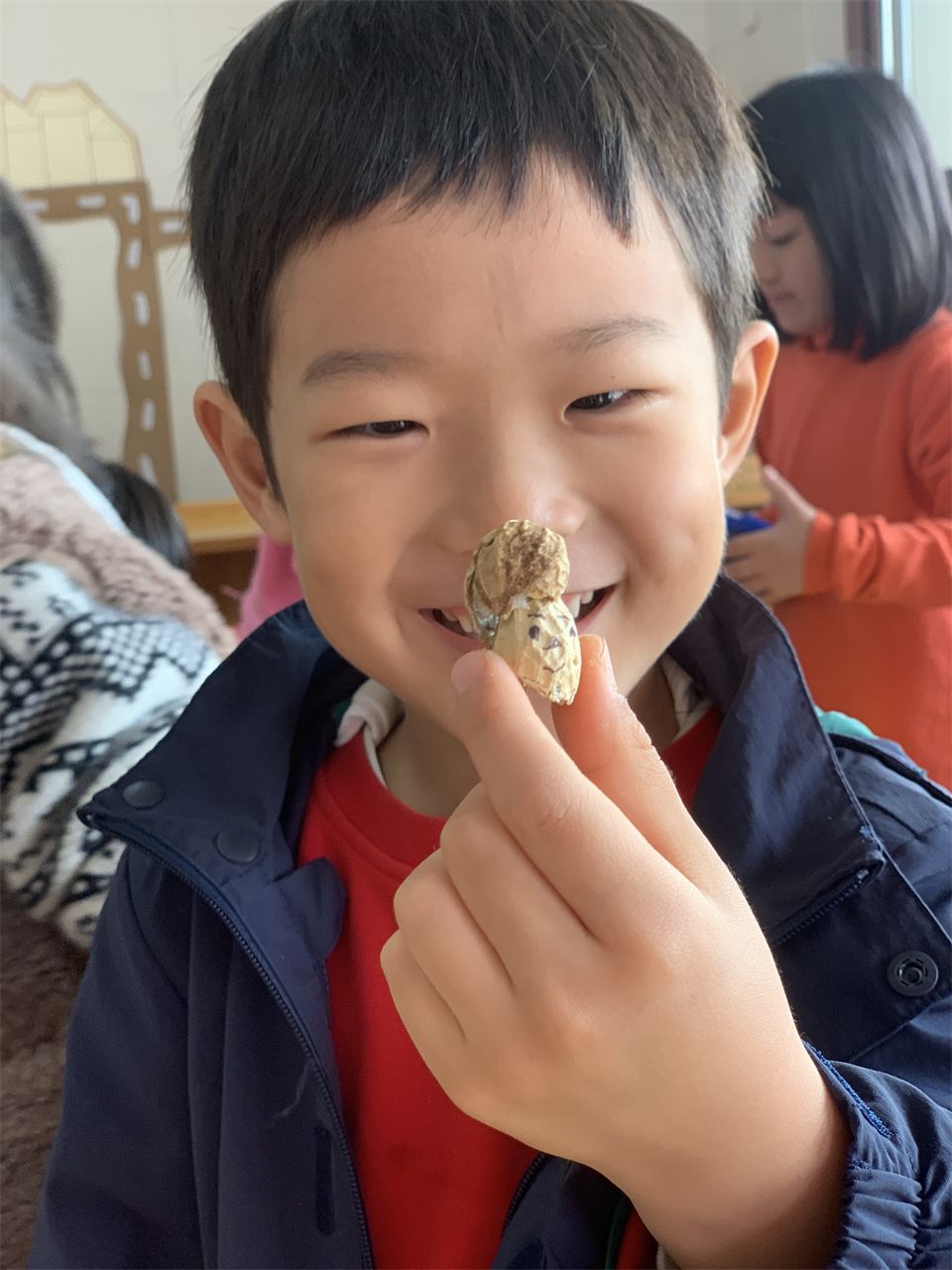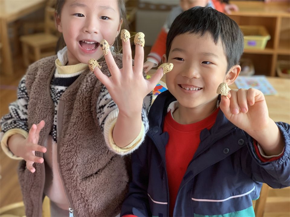 花生壳也被孩子们玩出了新花样,套到指尖变成了独一无二的美甲,加上表情就是花生指偶,直接可以表演故事了,真是太有趣了。