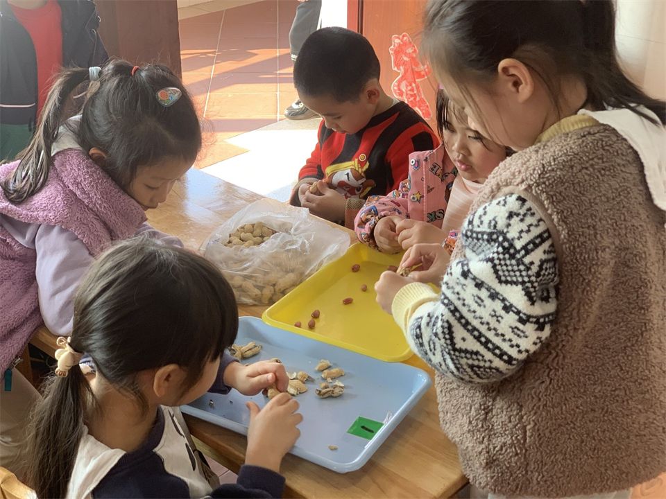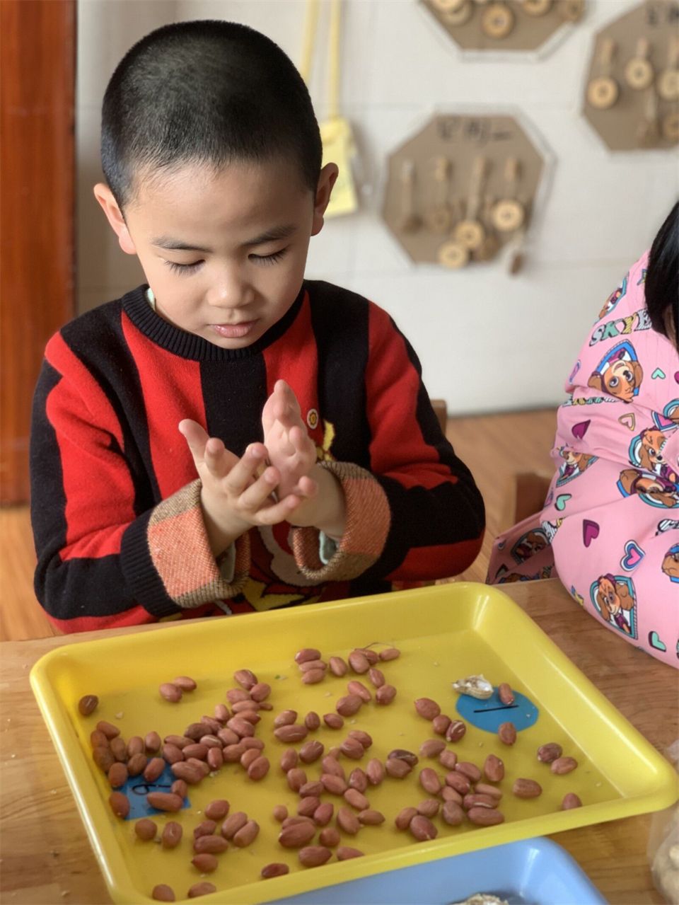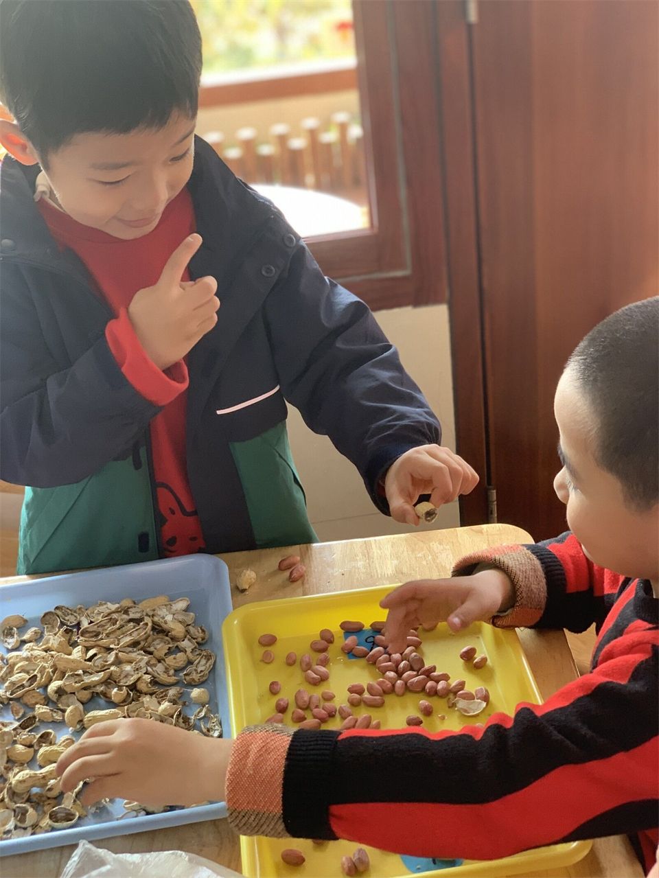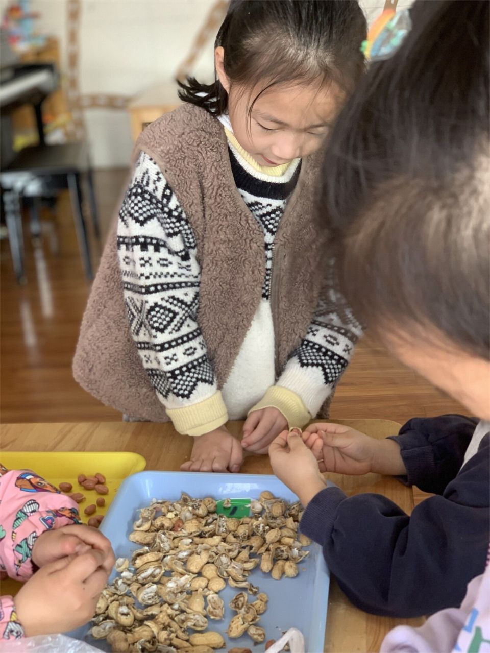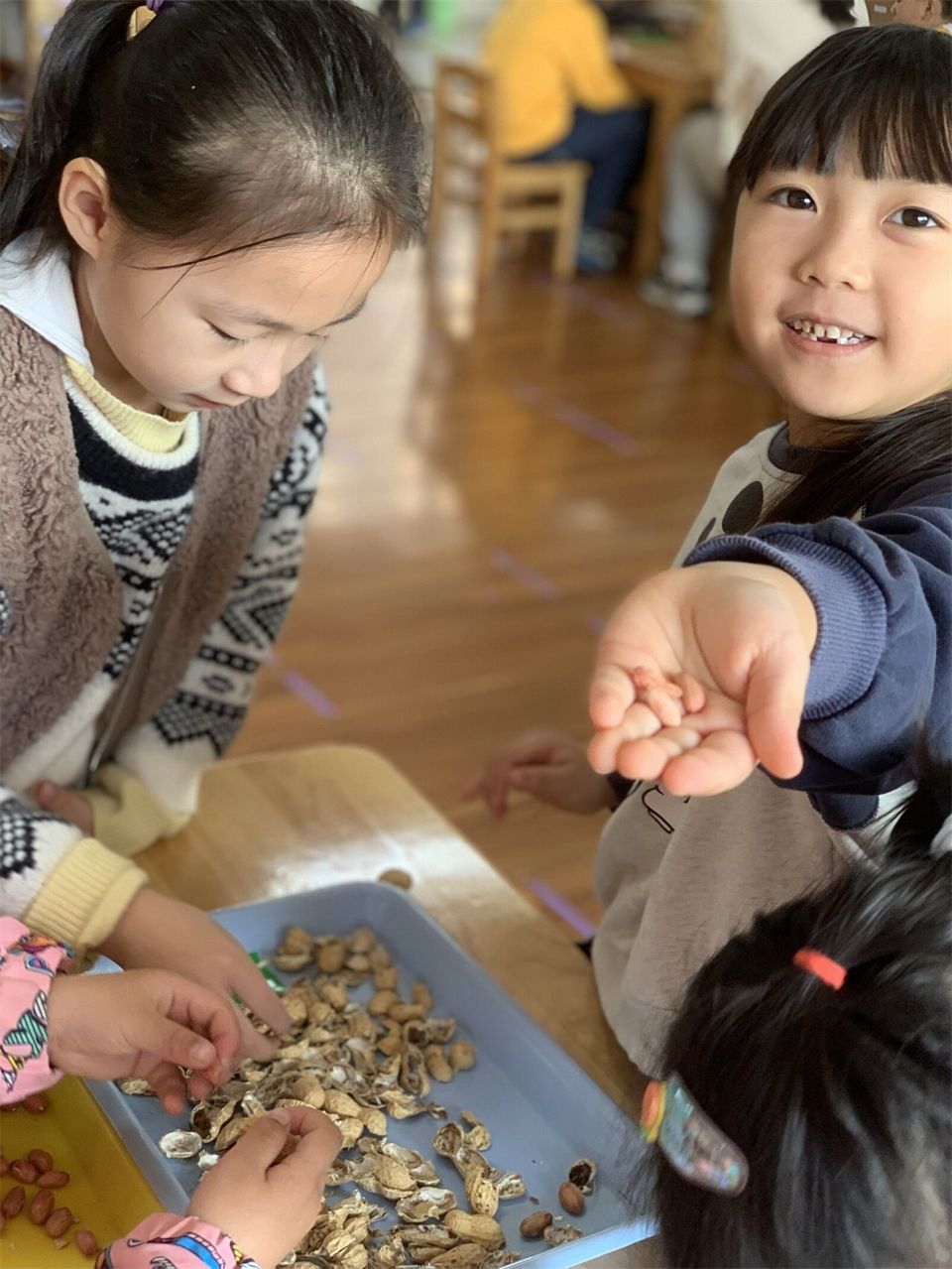 种植花生第一步——种子。花生种子买来了,但是需要自己剥壳。孩子们自信满满,摩拳擦掌。但不一会——“我的花生太硬了,我剥不开。”“我的花生被我掰断了。”孩子开始了“剥花生”的各种尝试。拍、压、摁、砸……大家各显神通,使出浑浑身解数,在孩子们的各种“技术”下花生坚硬的果壳被破开了,一颗颗饱满的花生被剥了出来。