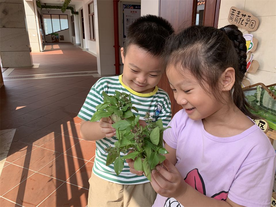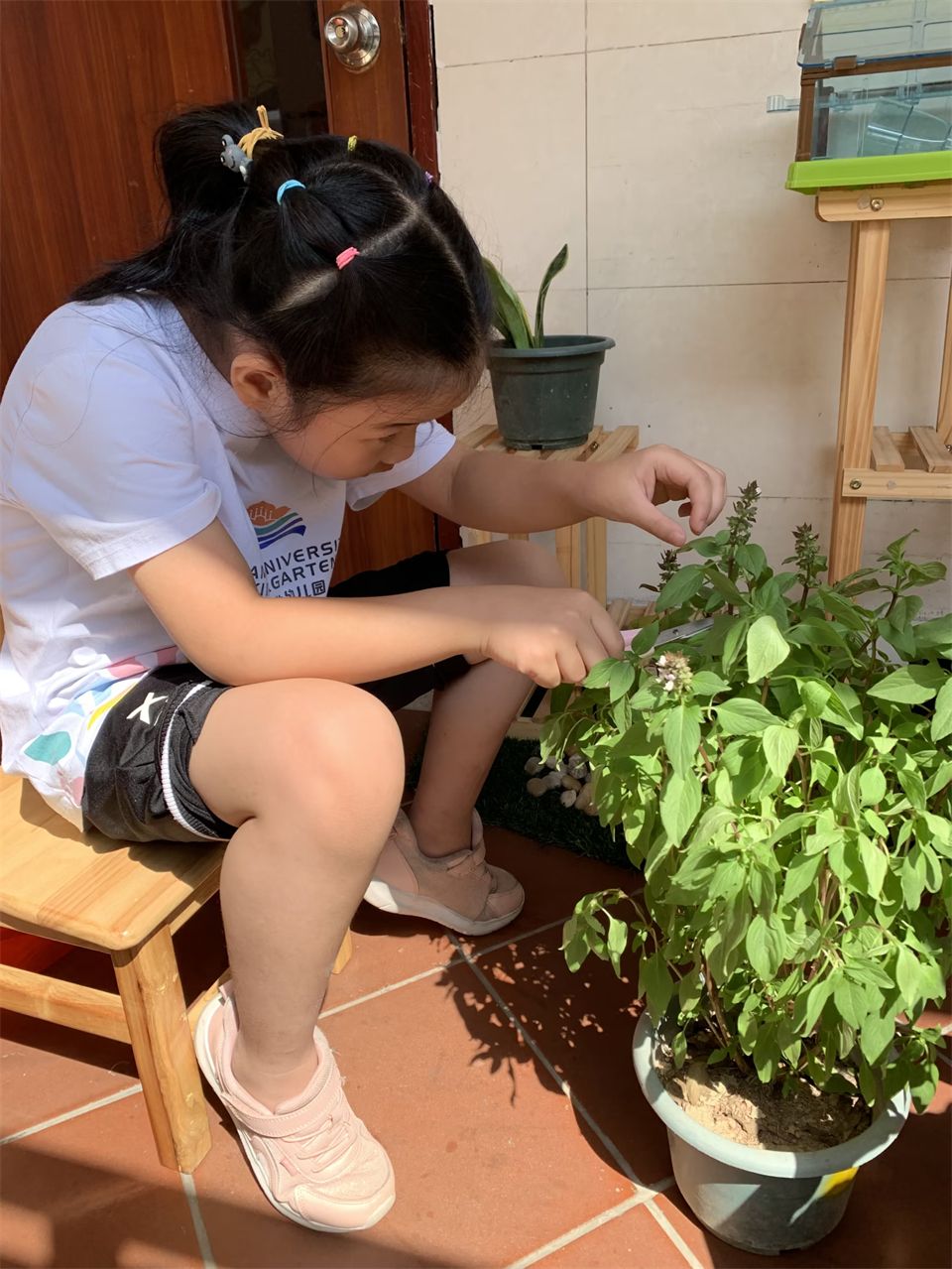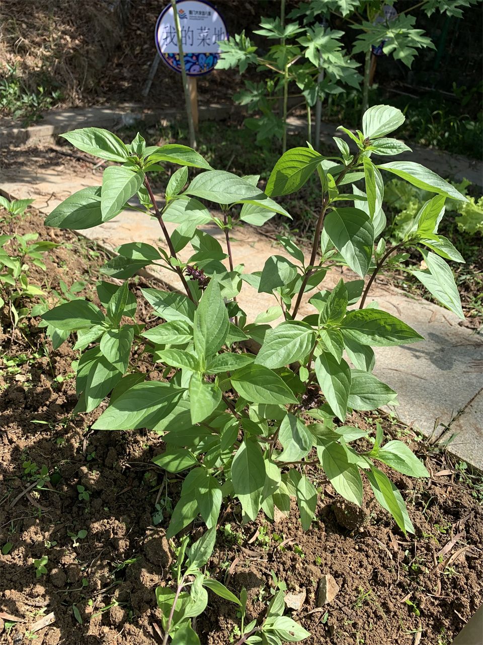 小小的九层塔在阳光下一天天成长,相信不久的将来我们就可以把它摘回家炒菜啦。