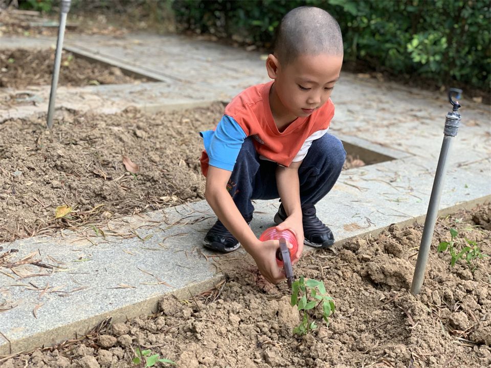松完土,宝贝们小心地将育好的小苗放进土里,把土埋好。
