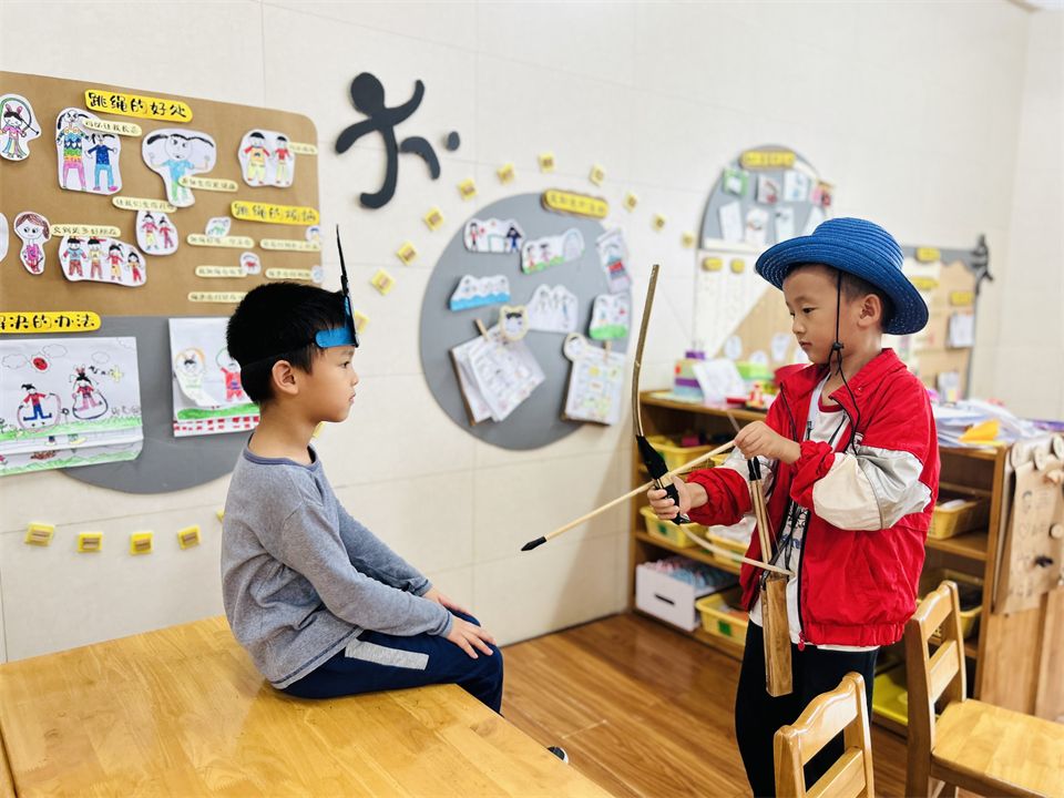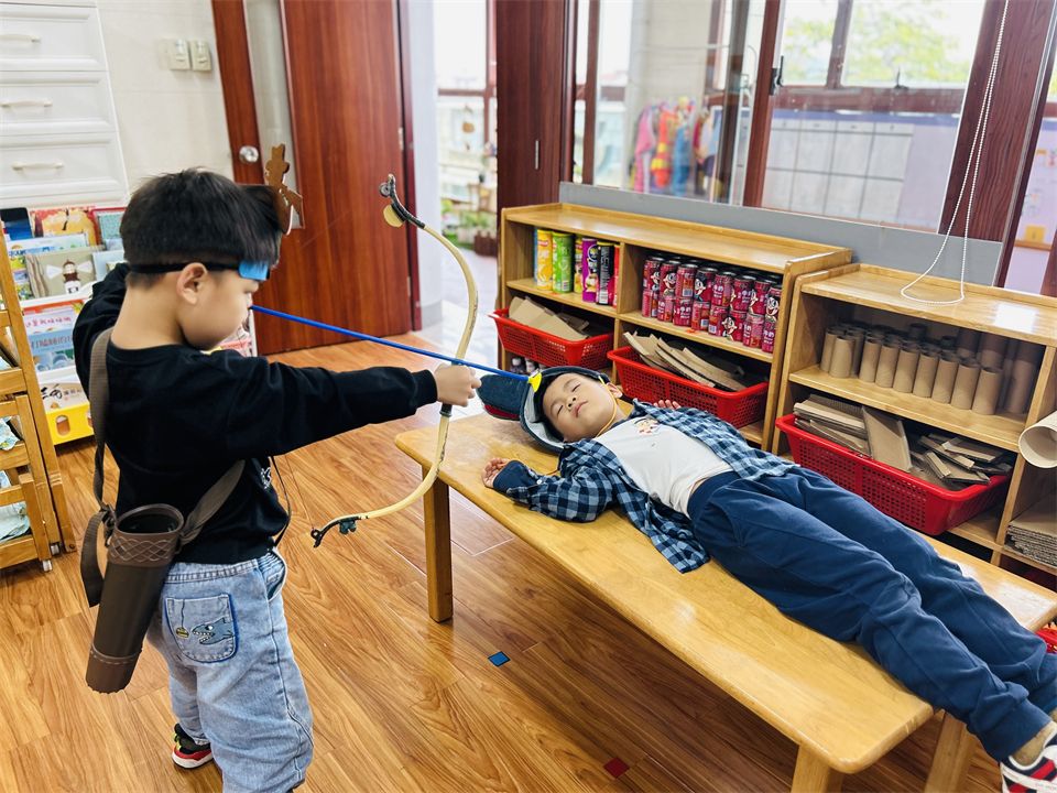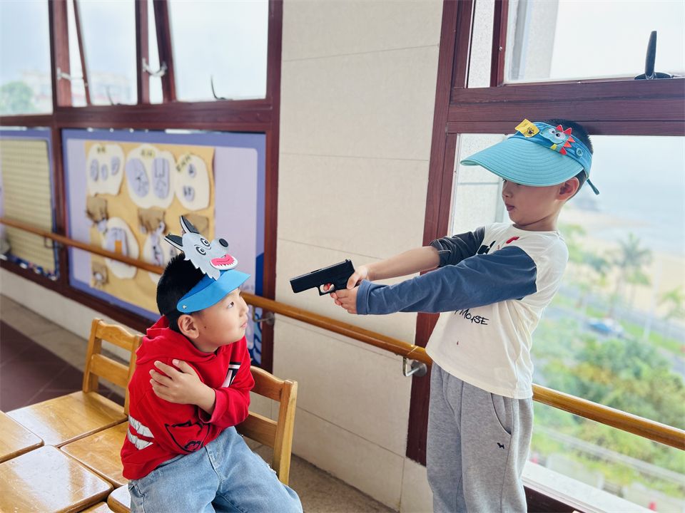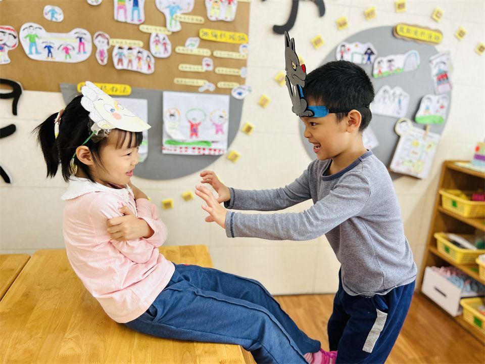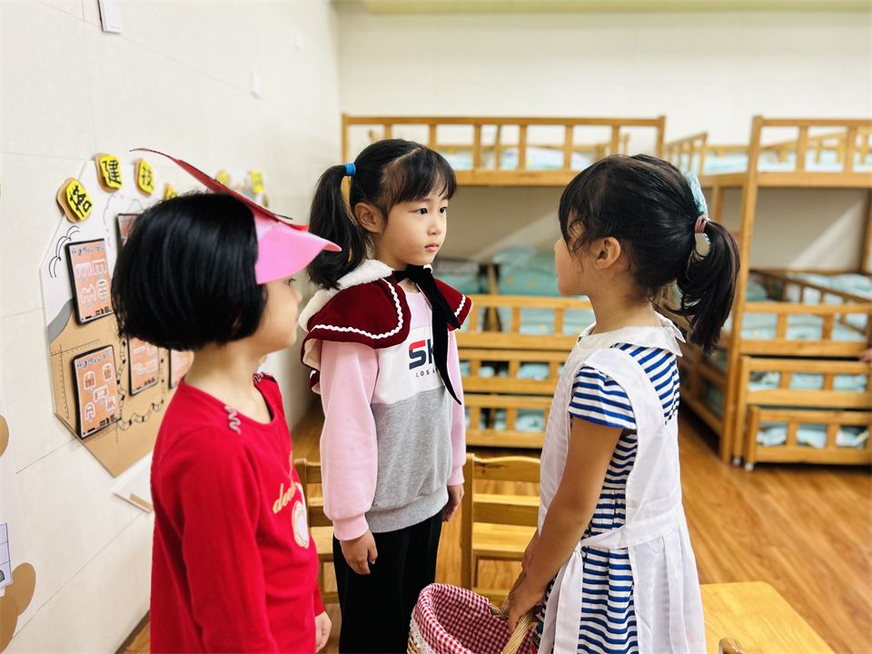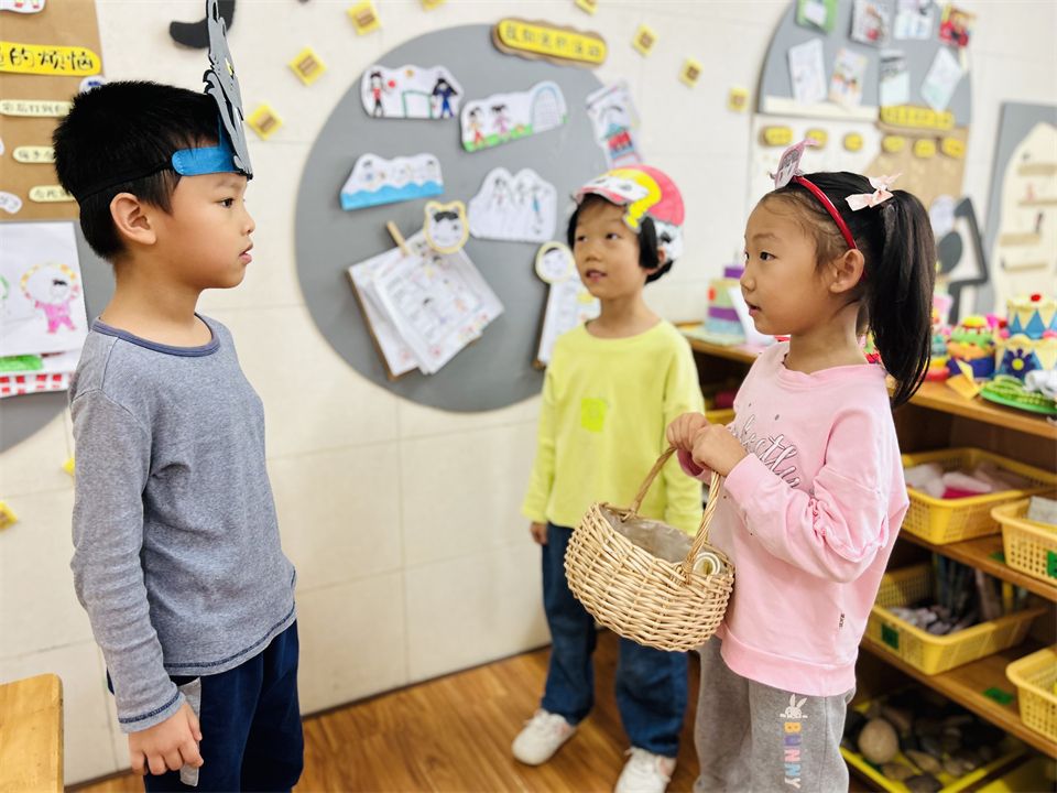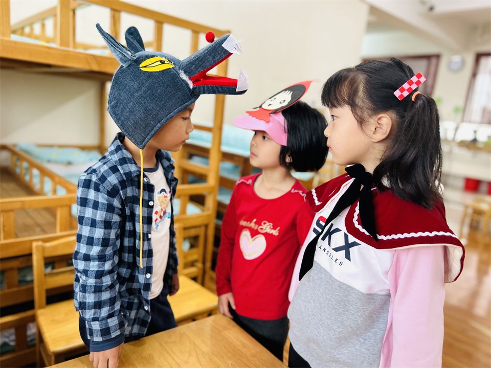 班级里的表演区游戏氛围也十分活跃,成了孩子们最受欢迎的地方,孩子们利用区域里的材料,继续演绎着“小红帽”的新故事……