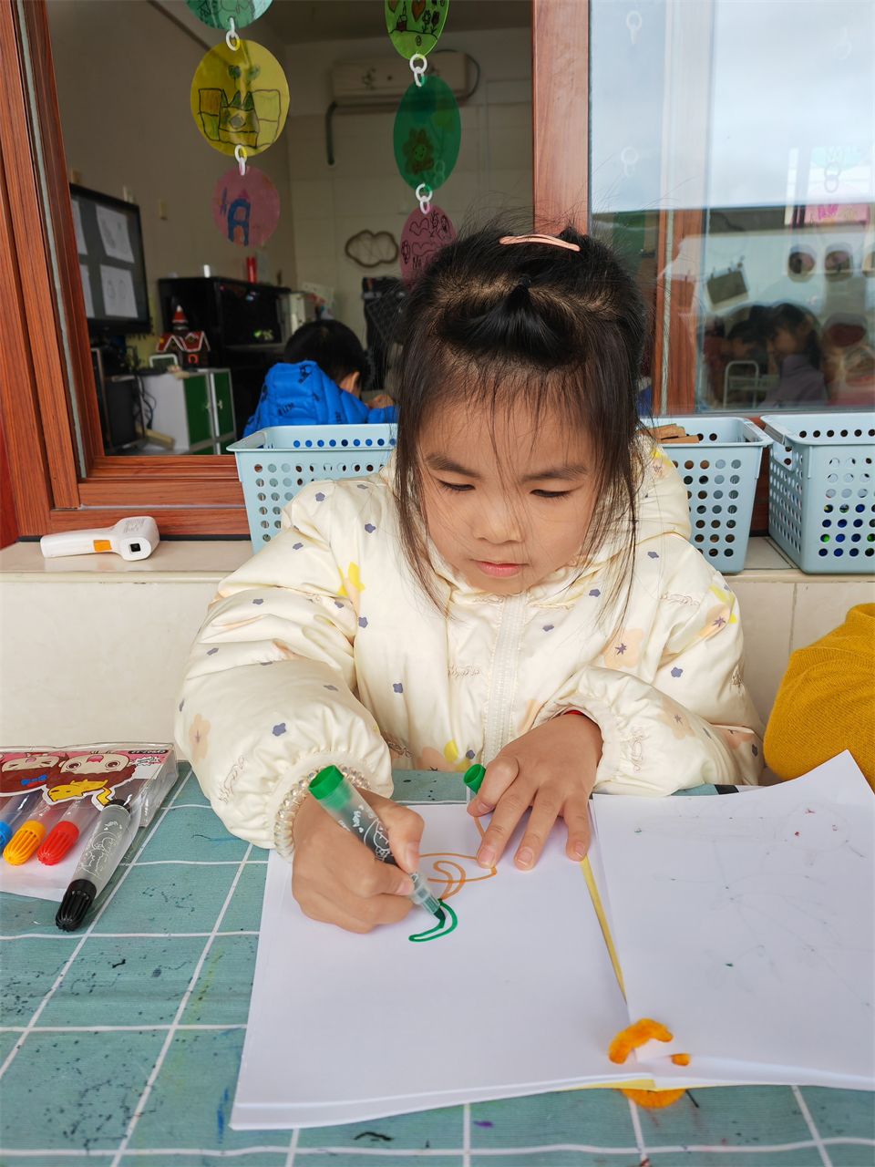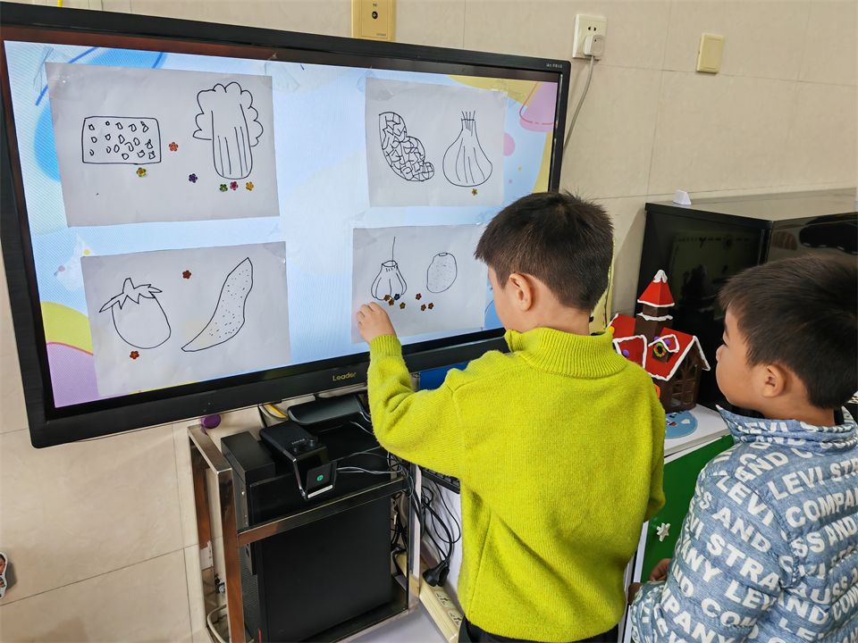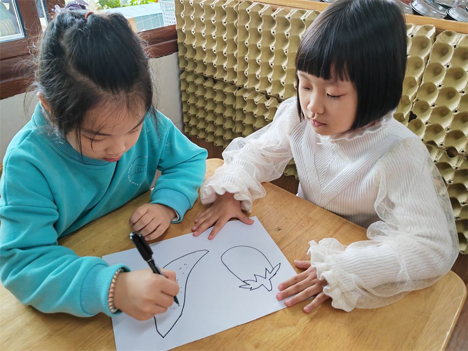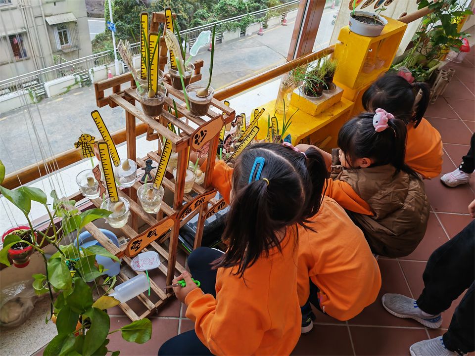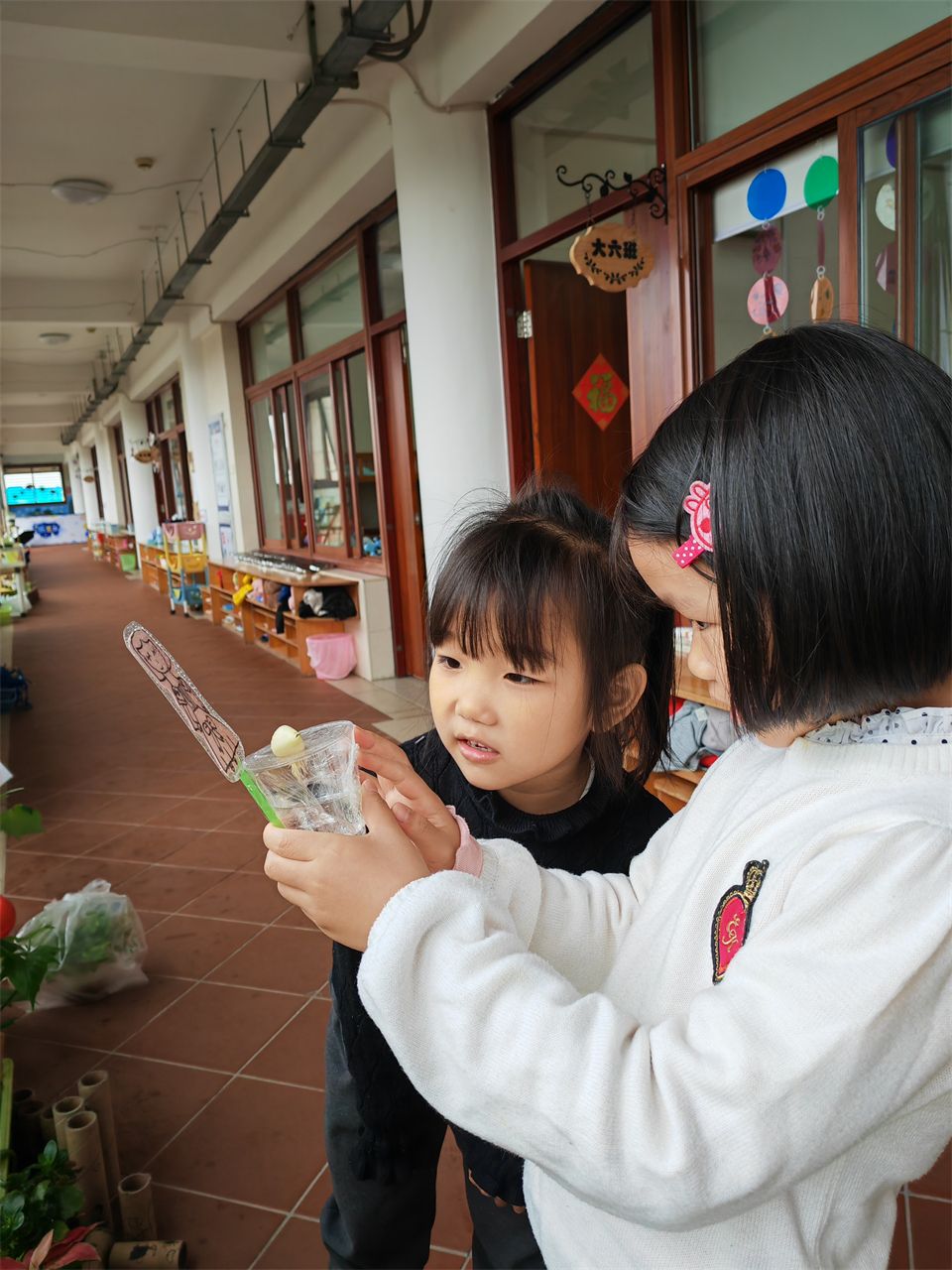 宝贝们惊喜于萌发的新芽和长高的蒜叶,开心地用笔记录下大蒜的生长过程。