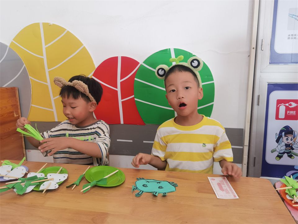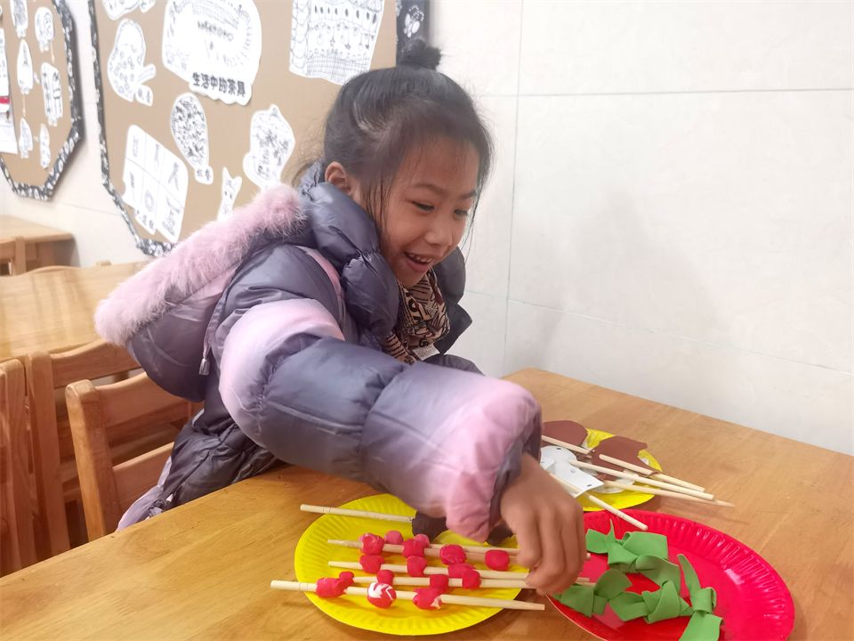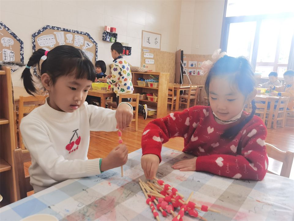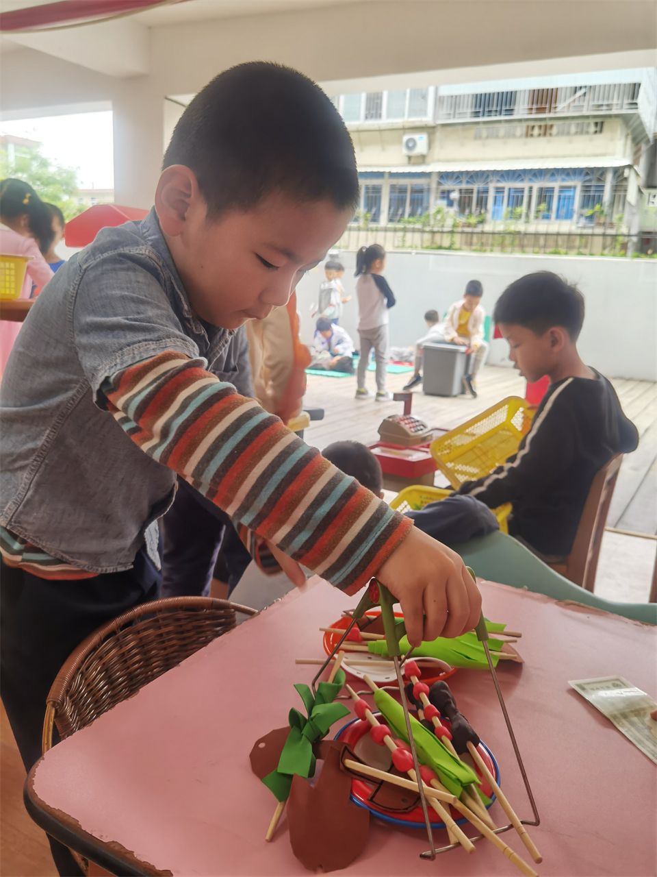 瞧!他们都在准备了些什么?有肉串、有丸子、有蘑菇、有青菜、有海带……小朋友们的小手真巧,一串串“烤串”在他们手里变了出来。