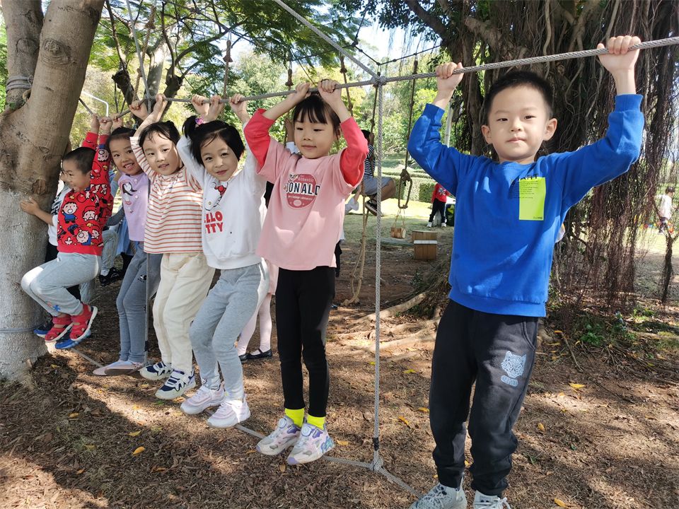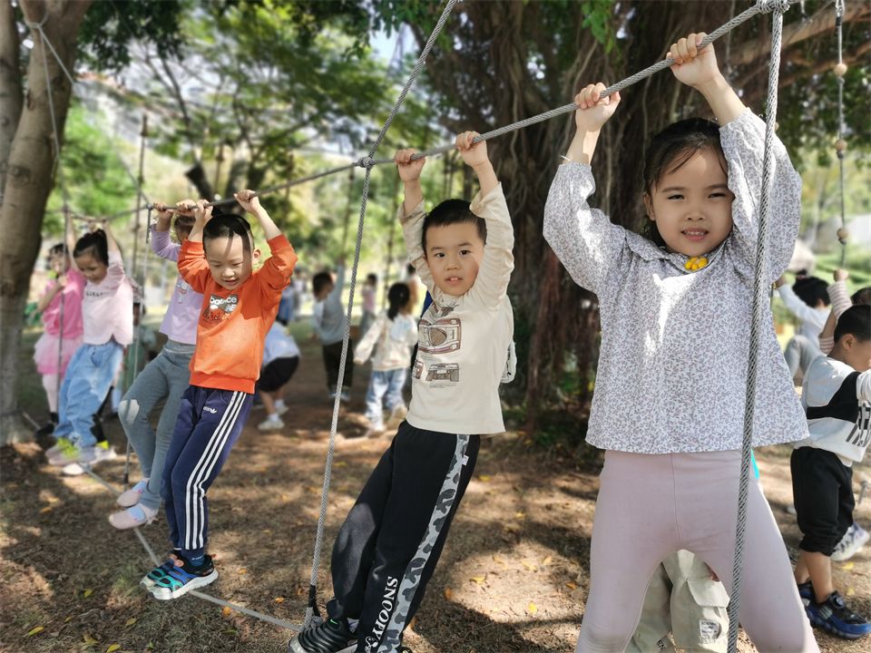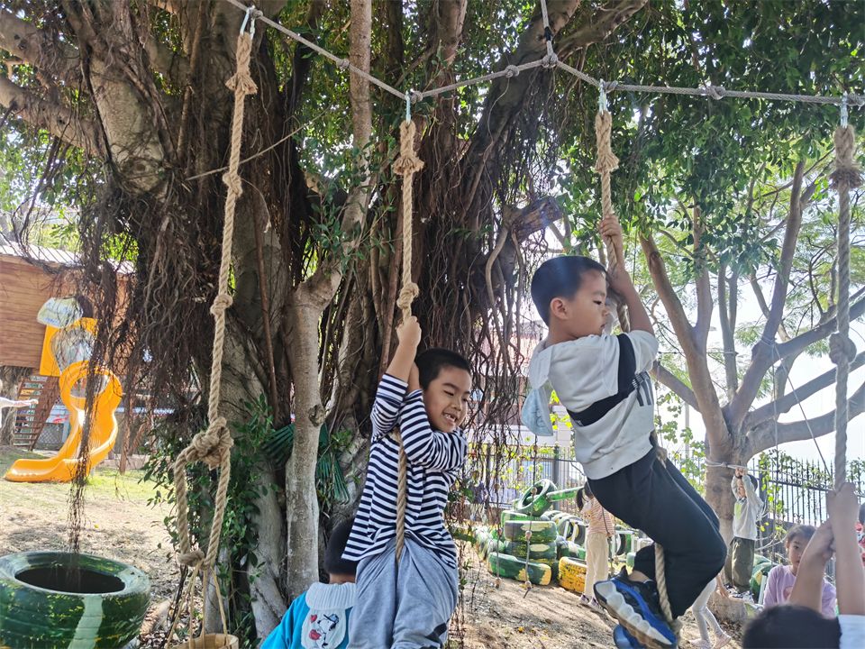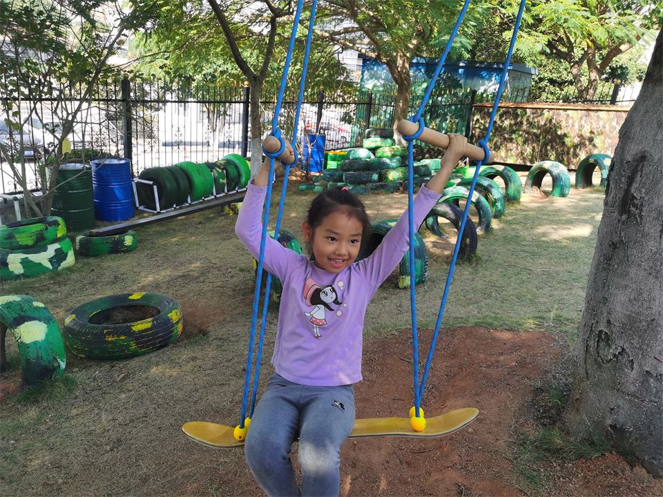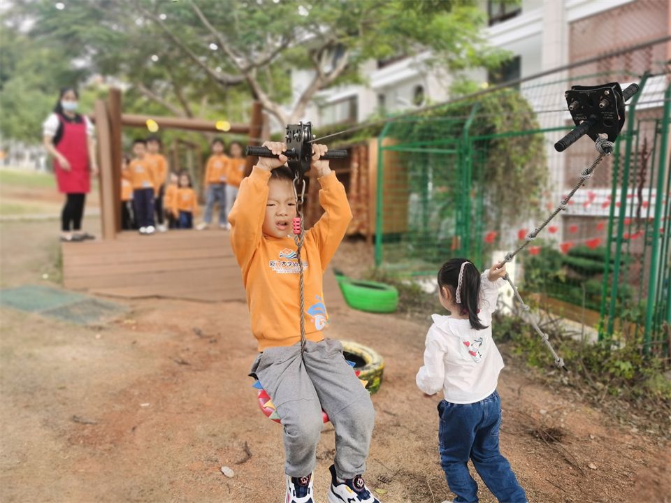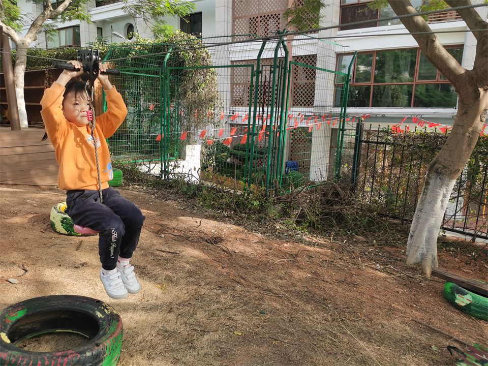 美丽的小山坡上有许多好玩有趣的运动项目,新投入的滑索和平衡绳吸引了热爱运动的孩子们。这是提升臂力、提高平衡能力和耐力、协调、合作能力的综合运动。运动让孩子拥有更加充沛的体力,赋予敢于挑战困难的勇气,他们一次次地跌倒,又一次次站起,感受着运动带来的乐趣!