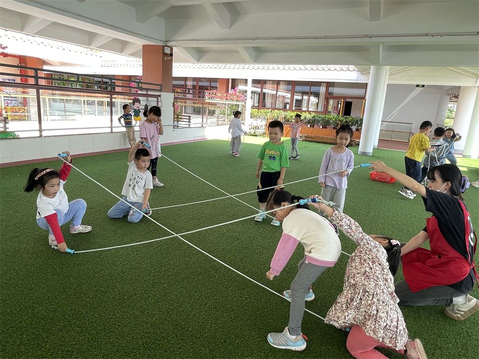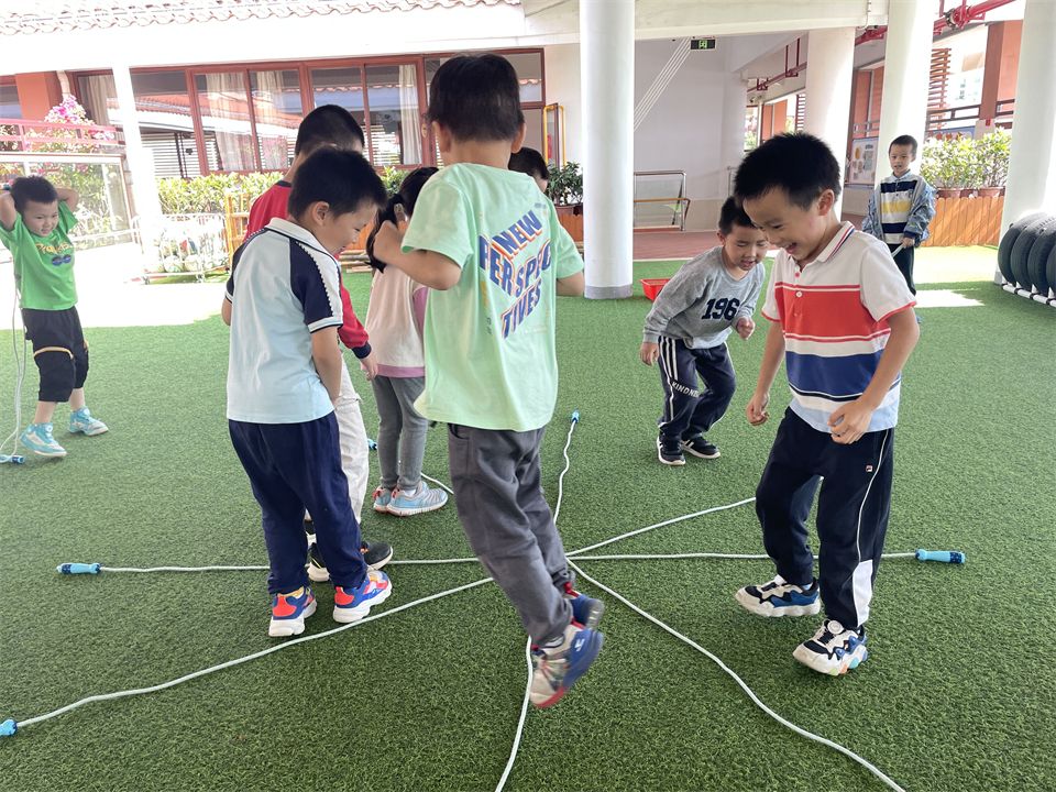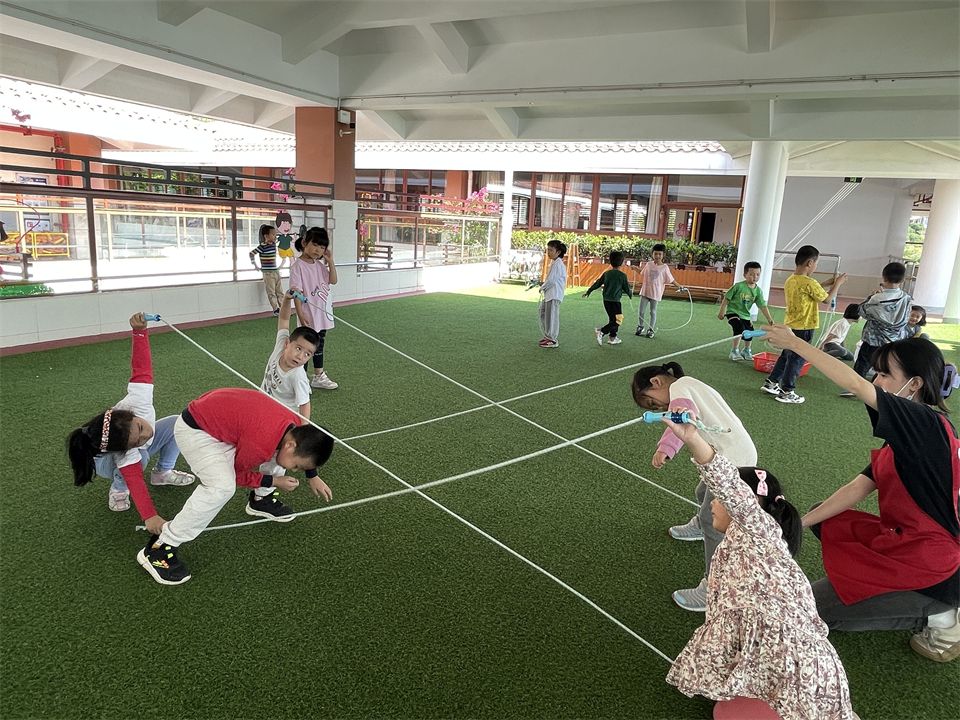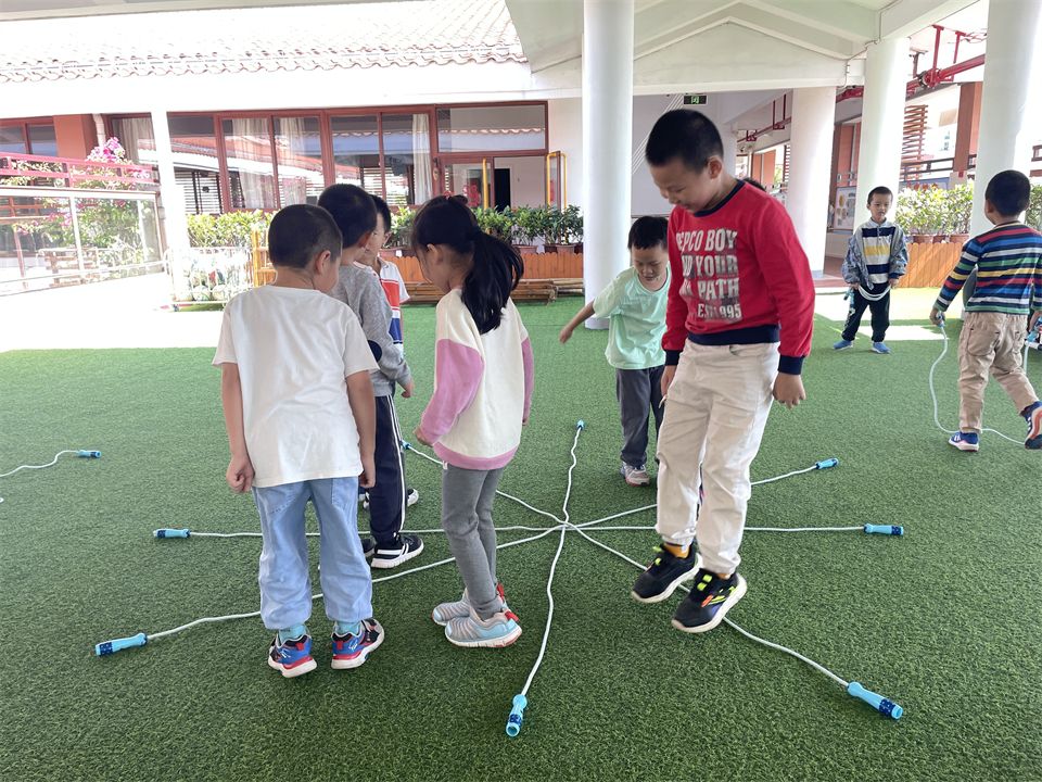 孩子们将跳绳摆出了米字型,站在空格中一个一个跳着玩,玩的不亦乐乎……