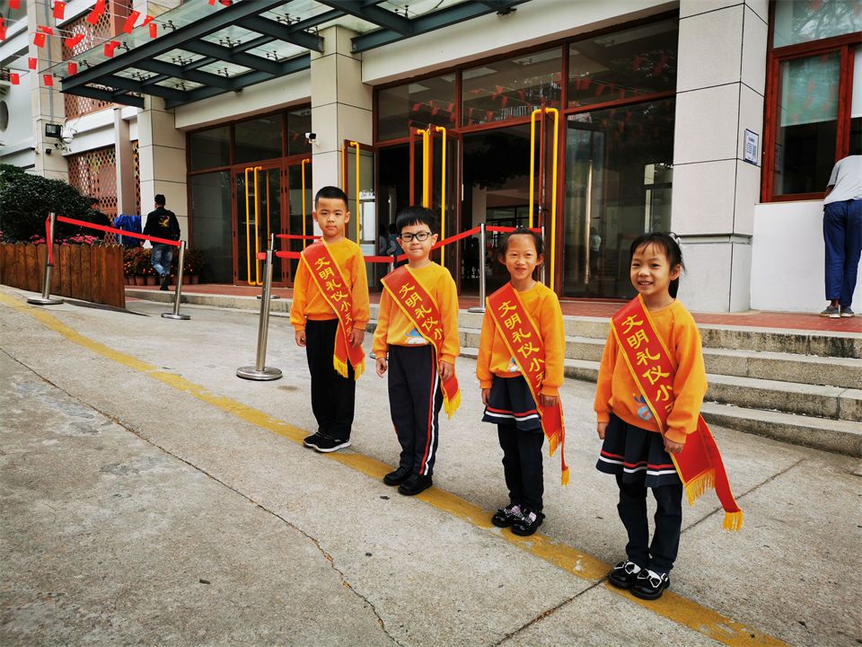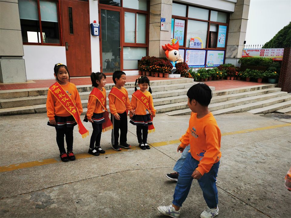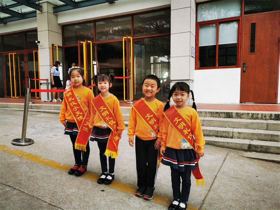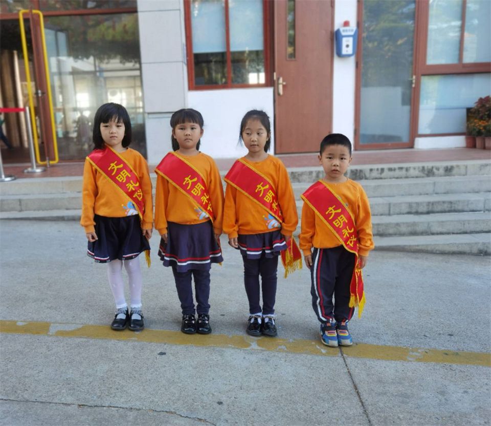 hello!早上好!清晨,我们早早入园,身披红色彩带,面带笑容,整齐、自信地站在园门口的位置上,用热情饱满的声音,亲切的小伙伴、老师们打招呼、问好,文明礼仪,从我做起。