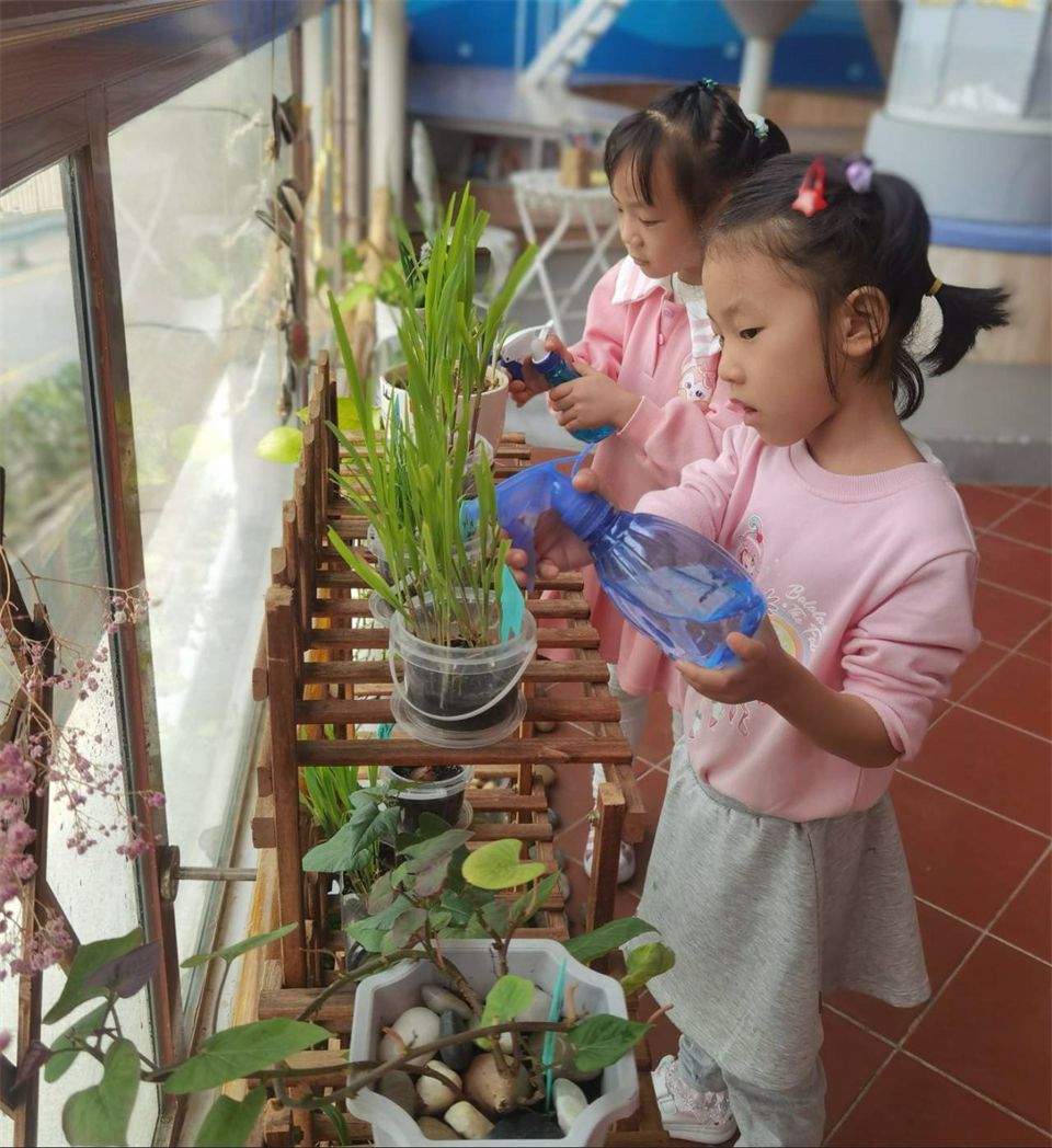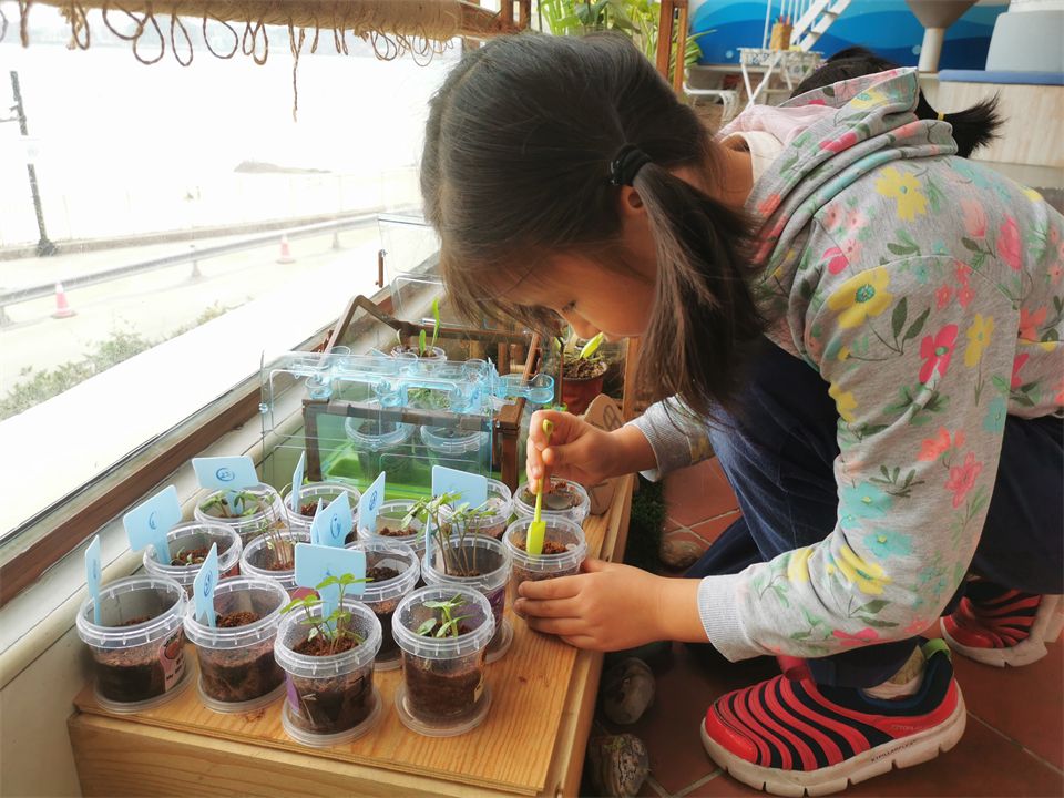 自然观察区里,我们化身“小农夫”,有的浇水、有的种植、有的松土、有的剪黄叶……在这小角落里我们悉心照料自己亲手种下的植物,观察小植物们一点一滴的成长,发现小植物的成长痕迹,还记录下每天的观察发现。