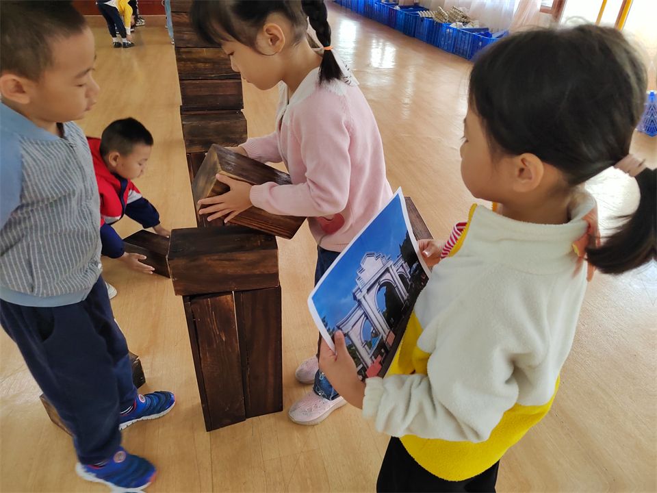 孩子们合理地运用垒高、架空、连接、围合等多种方法,以其丰富的想象、巧妙的创意、默契的合作,共同搭建出了别具特色的作品:白城幼儿园、大南幼儿园、科艺楼、勤业餐厅、南门。