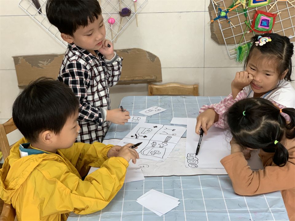 瞧,宝贝们为了角色游戏的开展做起了计划,人员怎么分配、需要什么材料,讨论氛围十分融洽。