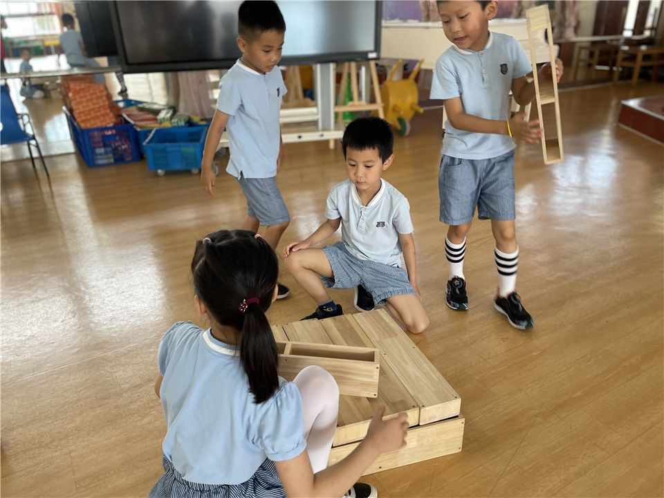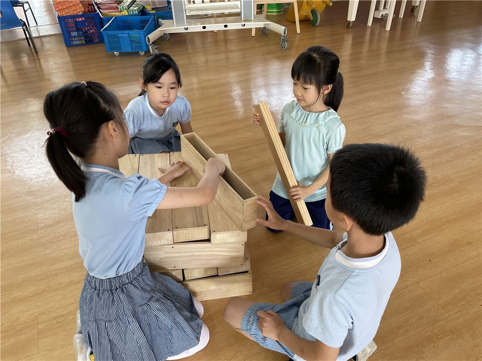 建构游戏中,孩子们与小伙伴一同讨论、构思小学的模样,建造他们心中的小学。