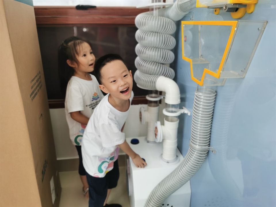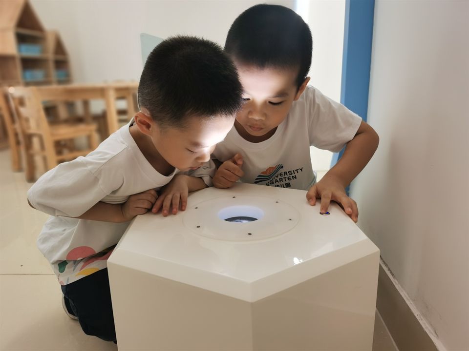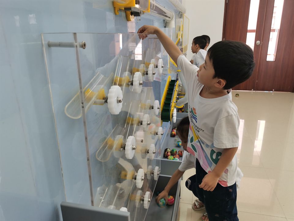 升大班后,我们第一次走进科学发现室,去探索科学的奥秘。我们惊讶地发现:机器人会走动;小箱子中有电源会发光:两个彩色转盘相碰会变色;小球会在管道中滚动……