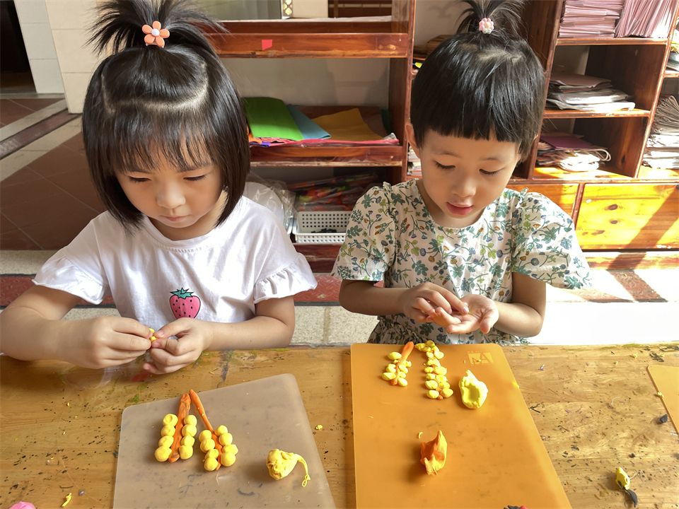 孩子们尝试着通过绘画、利用团、搓、捏等方式对彩泥进行塑形,尽可能地表现出麦穗的特点,麦秆长长的,麦粒圆圆的鼓鼓的……