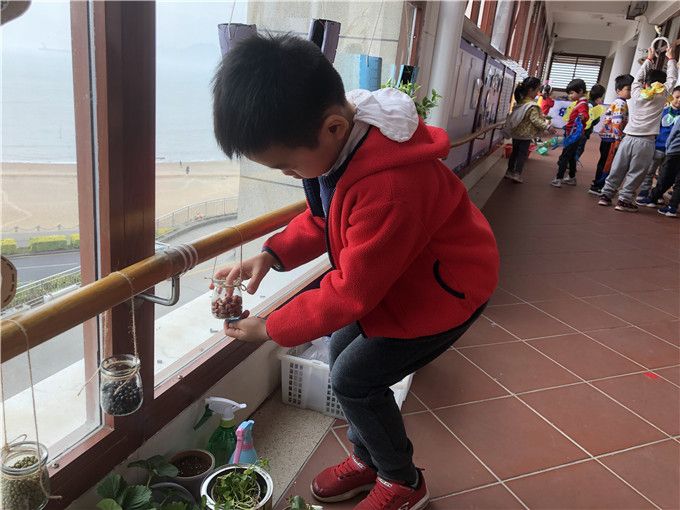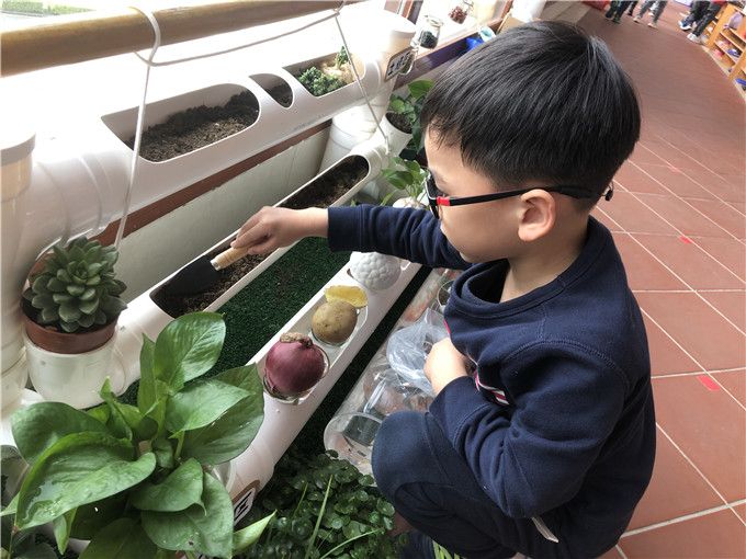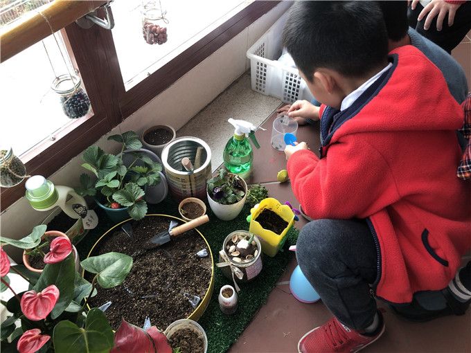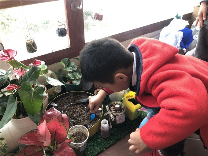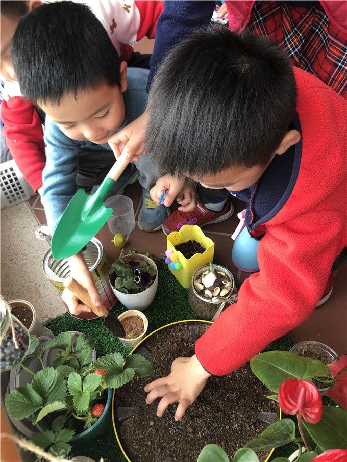 在家长的帮助下,孩子们带来了自己喜欢的植物种子。“这泥土黑黑的,肯定能供给我的小植物很多养料,让我的小菜苗长得又高又壮。”松土、撒种、再盖上土,小种子快快长!