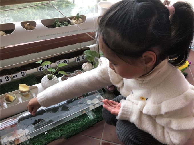 透明的pvc管是小小鱼儿的家园,有了这些活泼的小生灵,我们的自然角增加了许多生气。小鱼儿,我来给你喂食。