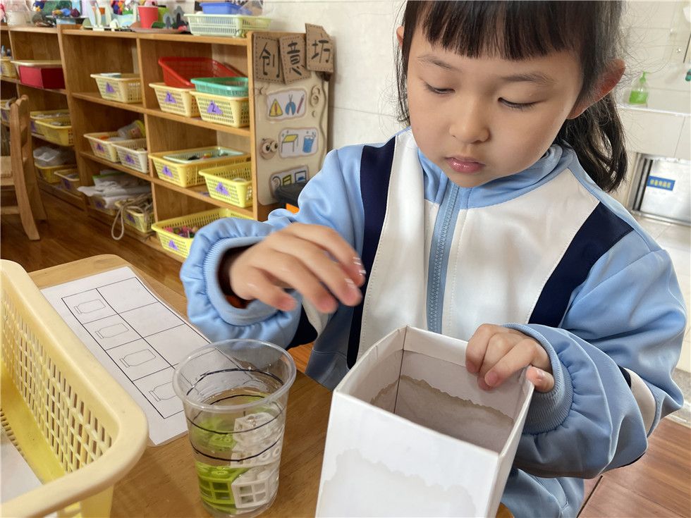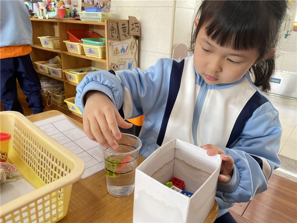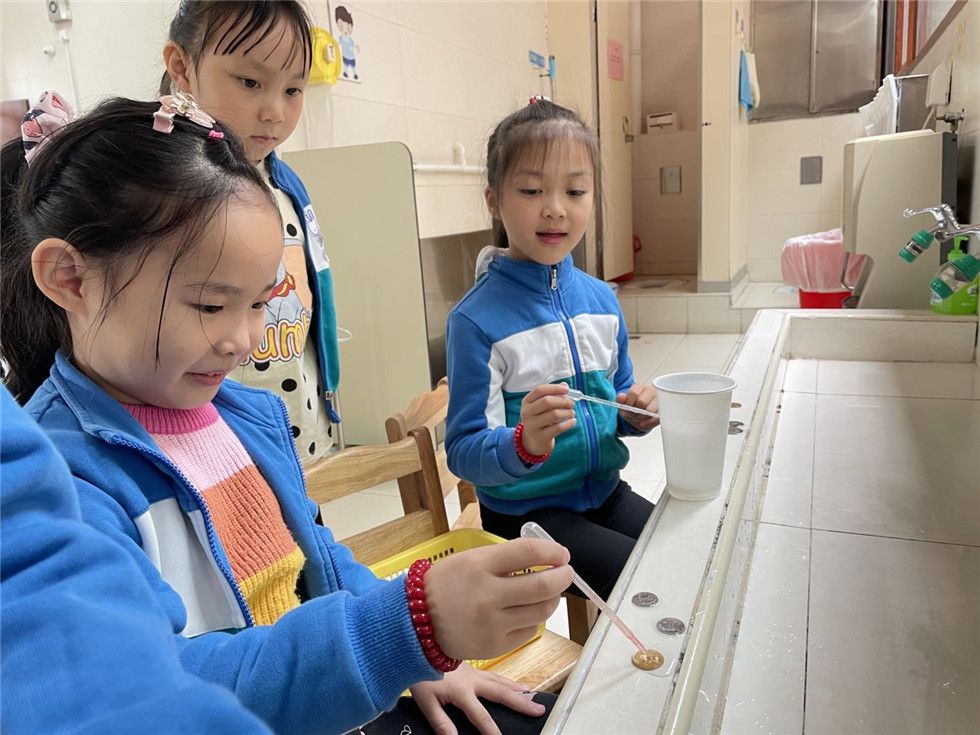 “硬币存水”也是热门抢手的区域材料。只见笋哥小心翼翼地拿着滴管,在硬币上滴上一滴又一滴的水,嘴中数着:“一、二、三、四、五!”他兴奋地告诉其他福娃,五角的硬币可以存五滴小水滴!其他幼儿也跃跃欲试,拿起滴管,做起了一角和一元硬币的实验。