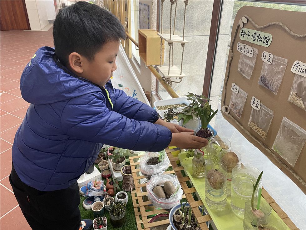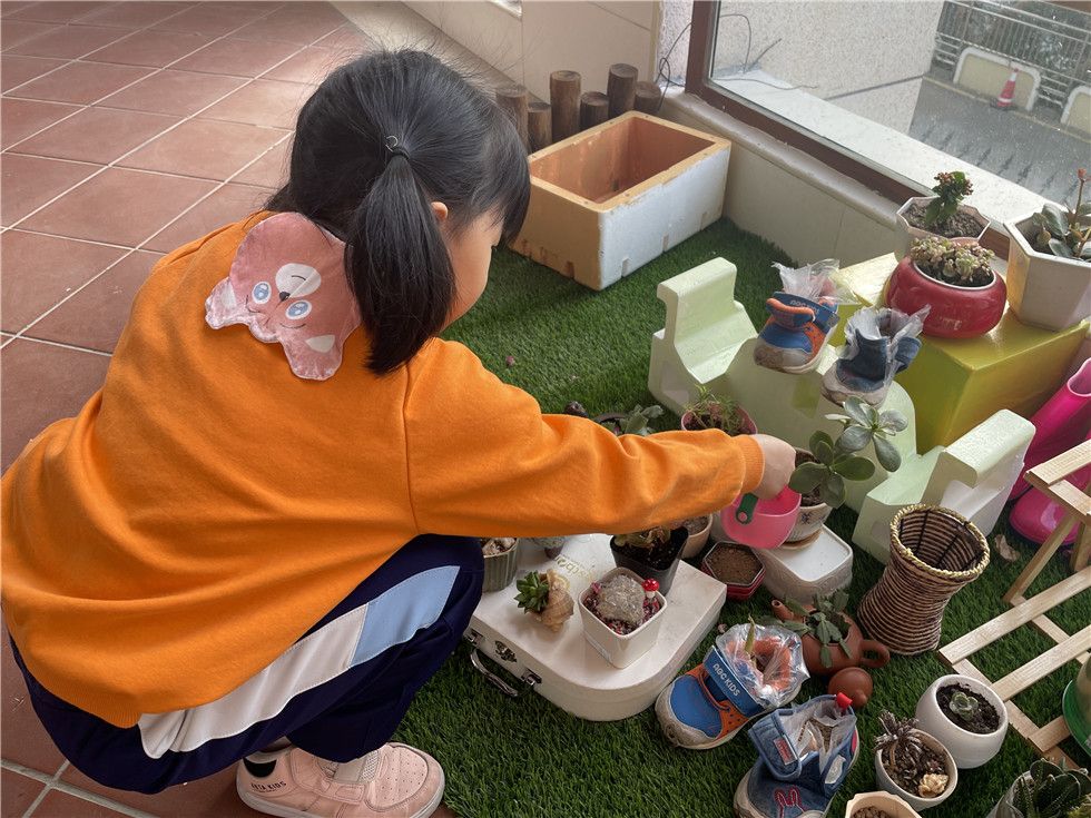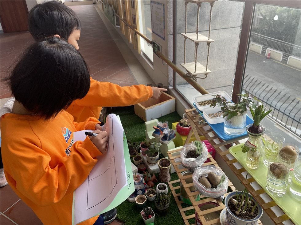新增的自然角也处处有水的“身影”。福娃们仔细观察、记录水培区中绿豆、黄豆、土豆、大蒜的生长情况,给风信子换水,给多肉浇浇水,悉心地照料着自然角的植物。