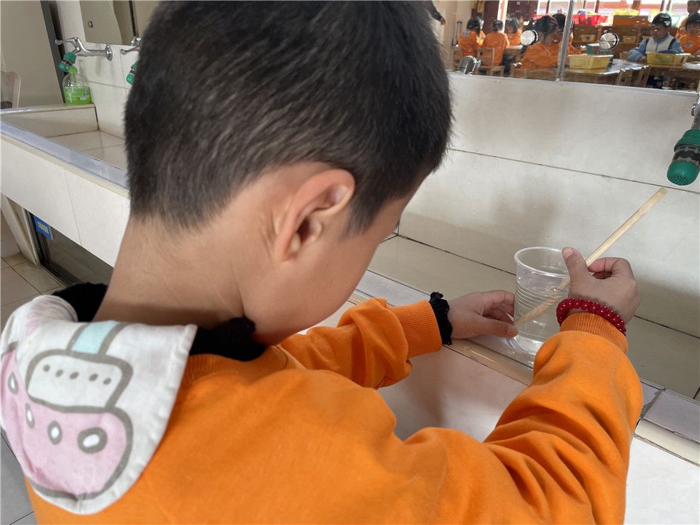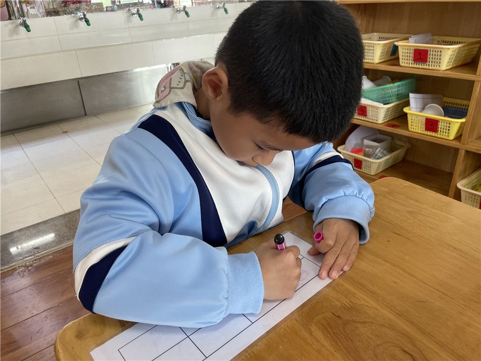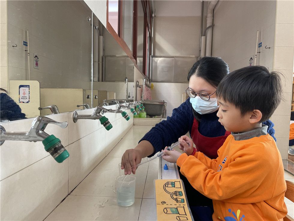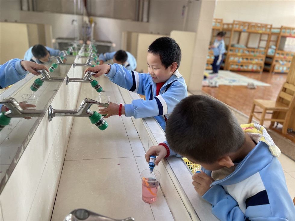 一天,老师给福娃们展示了一个“魔术”——在下方杯子的水,居然“跑”到了上方的杯子里。区域活动一开始,福娃们争先恐后地到科学区想要一探究竟。只见攀攀在老师的帮助下,将下方杯子的水用针筒抽出,通过水管放到上方的杯子上,水竟然源源不断地流出来了,这可太神奇了!攀攀兴奋得手舞足蹈。