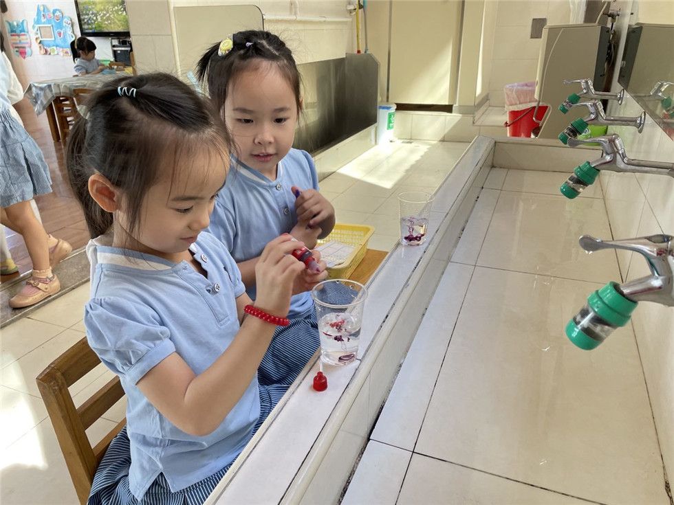科学区的“颜色变变变”是福娃们一直以来都喜爱的区域材料。福娃打开水龙头,杯子中接好水,将蓝色的颜料滴入水中,观察颜料在水中的变化。他用塑料棒搅拌,水立马变成蓝色的了。这时棋棋提出了疑问:“老师的绿色颜料是用蓝色和黄色调出来的,水也能变成绿色吗?”于是两人大胆尝试,将黄色的颜料滴入其中,杯中出现了绿色的液体。老师引导他们将自己的发现记录下来,并尝试用更多颜色,记录下水中颜色的变化。