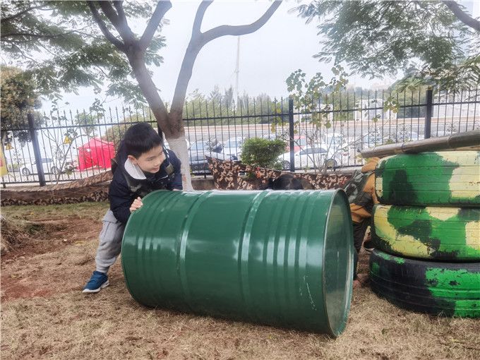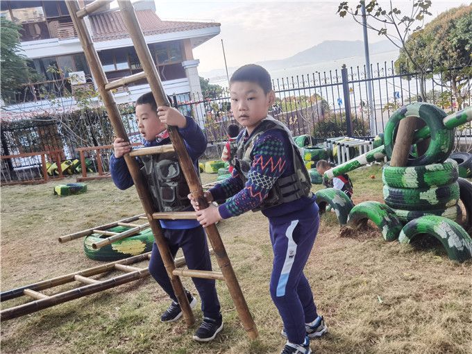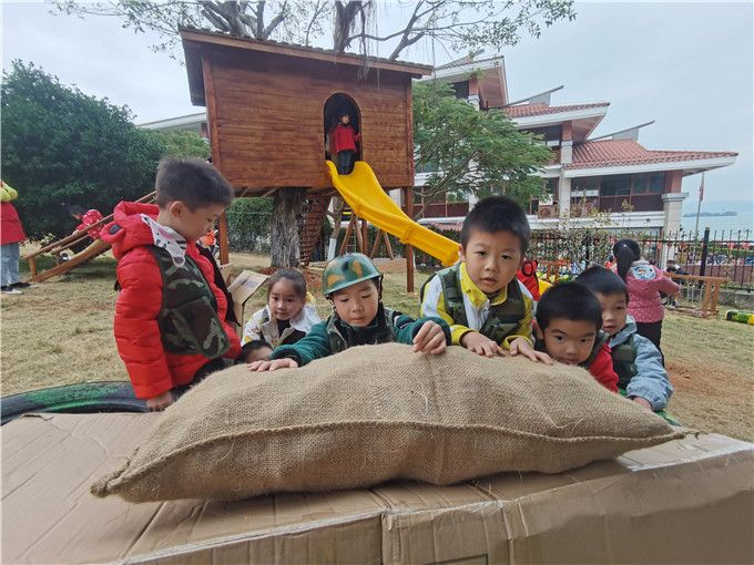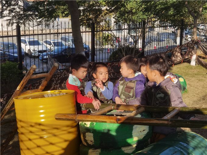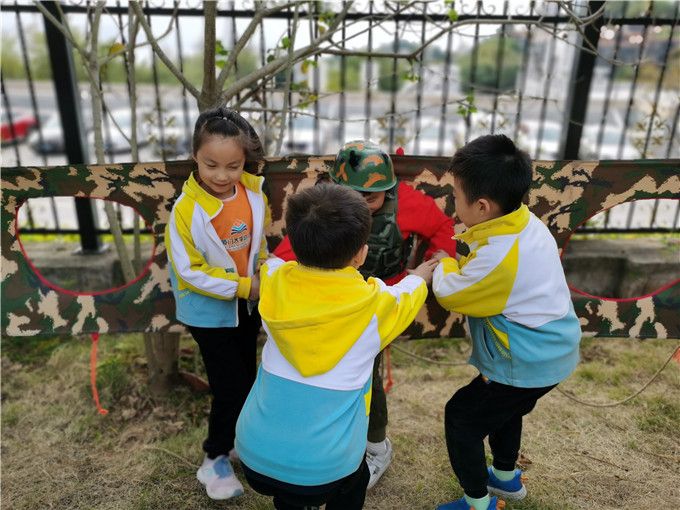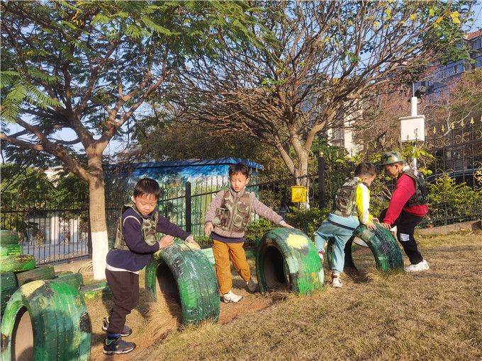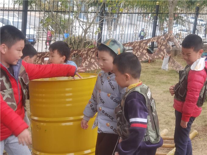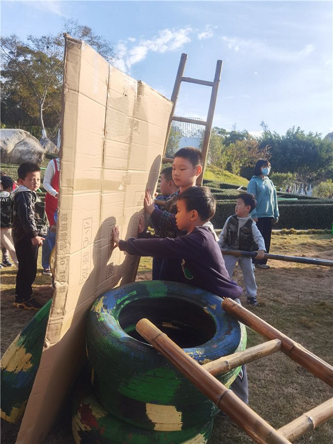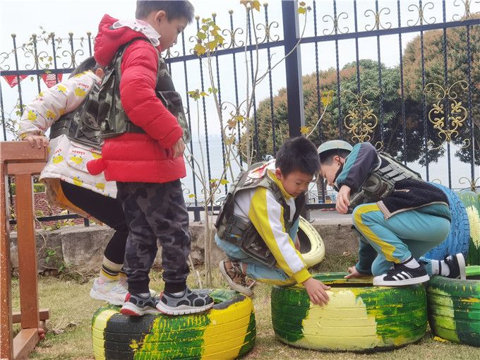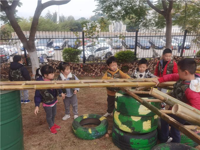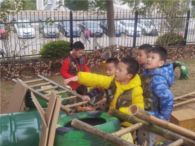成成队长一边带着队员寻找合适的路线,一边不忘提醒小伙伴:“大家要小心,不要掉下去啦!”“坤洋你踩着轮胎这里,比较安全哦。”小兵们一个接着一个小心翼翼地踩在轮胎上,走过荡荡桥,检查着大炮。