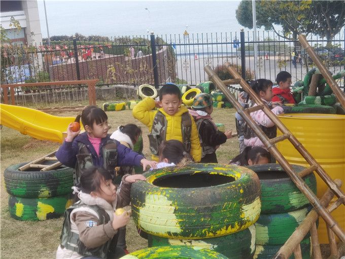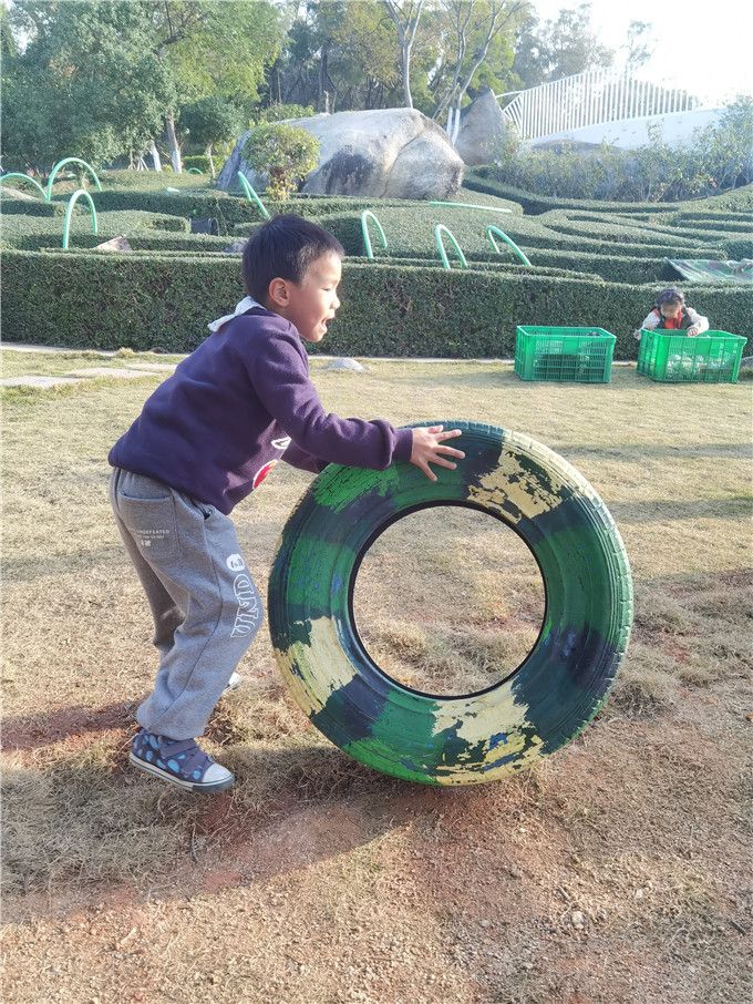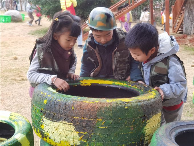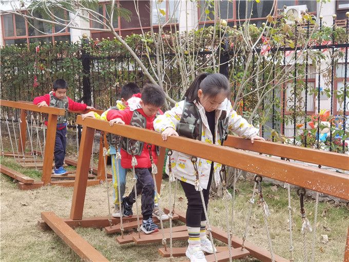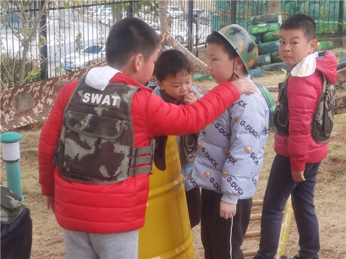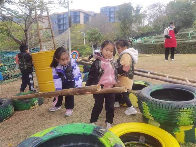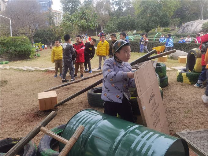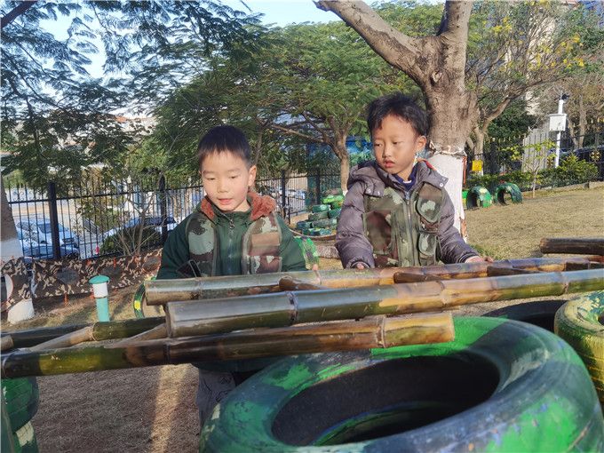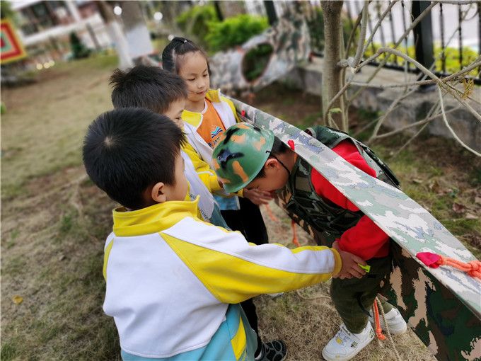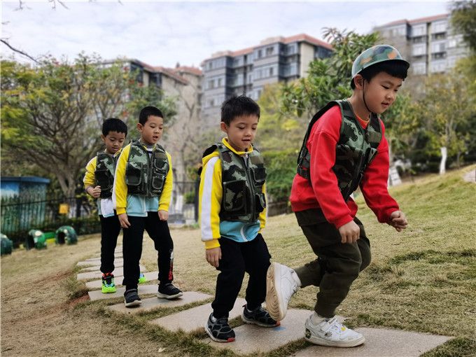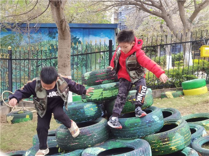 成成队长一边带着队员寻找合适的路线,一边不忘提醒小伙伴:“大家要小心,不要掉下去啦!”“坤洋你踩着轮胎这里,比较安全哦。”小兵们一个接着一个小心翼翼地踩在轮胎上,走过荡荡桥,检查着大炮。